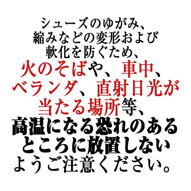 注)シューズのゆがみ、縮みなどの変形および軟化を防ぐため、火のそばや、車中、ベランダ、直射日光が当たる場所等、高温になる恐れのあるところに放置しないようご注意ください。