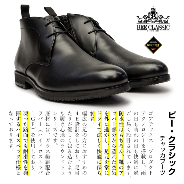 防水・防滑仕様の本革チャッカブーツ。ゴアテックス プロダクトテクノロジーを搭載し、雨の日も晴れの日も快適に過ごし易く設計されています。防水性はもちろん、靴のアッパー部分から蒸れた空気を外に逃がし、足元を常にドライで涼しく快適に保ちます。幅広の足の方におすすめの4E設計をしており、足当たりが優しく包み込むような履き心地のラウンドトゥシリーズです。底材には、ガラス繊維配合ラバー(ハイドロストッパーGF)を使用しており、凍った路面でも耐滑性を発揮するハイスペック仕様となっております。