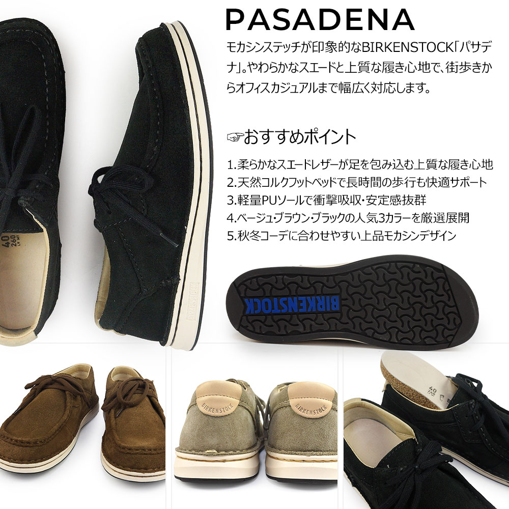 モカシンステッチが印象的なBIRKENSTOCK「パサデナ」。やわらかなスエードと上質な履き心地で、街歩きからオフィスカジュアルまで幅広く対応します。天然コルクフットベッドが足の形にしっかりフィットし、軽量PUソールが安定感ある歩行をサポート。ナチュラルで合わせやすいカラーをセレクトし、どんなコーディネートにも自然に馴染む万能カラー展開に。ギフトにも喜ばれる、上品カジュアルで快適な秋冬の一足です。■おすすめポイント