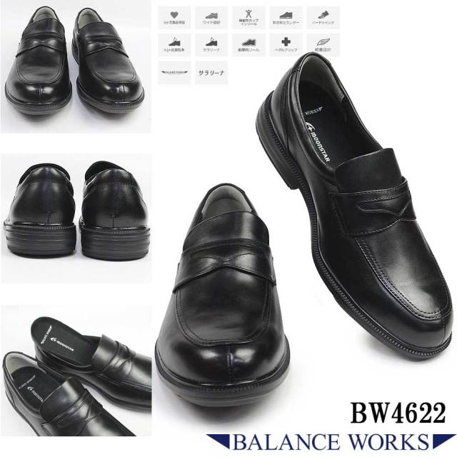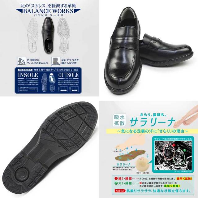 足のストレスを軽減するビジネスシューズ「バランスワークス」シリーズの4E(幅広)タイプです。「柔らかさ」と「安定性」を両立させた快適な着用感に加え、従来品から「軽量性」と「衝撃吸収性」をさらにアップさせたモデルです。