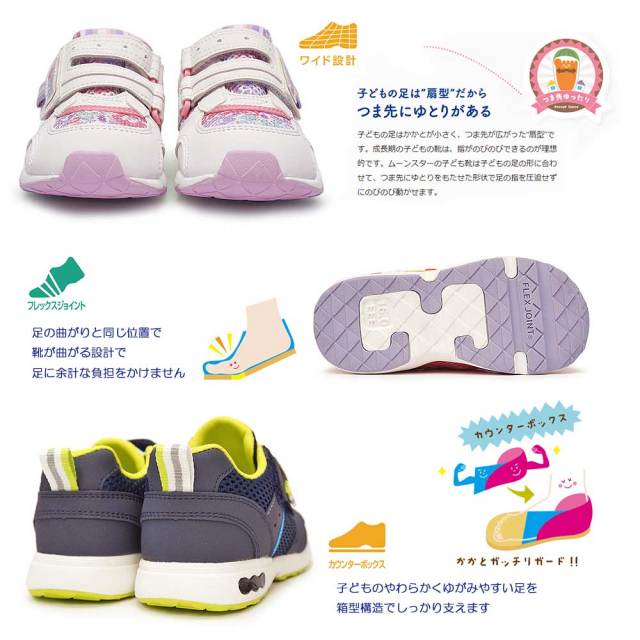子どもの足の成長をサポートする「4大機能(つま先ゆったり、カウンターボックス、フレックスジョイント、洗えるインソール)」により、健やかな成長を促します。
