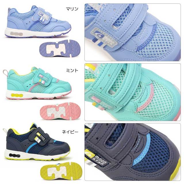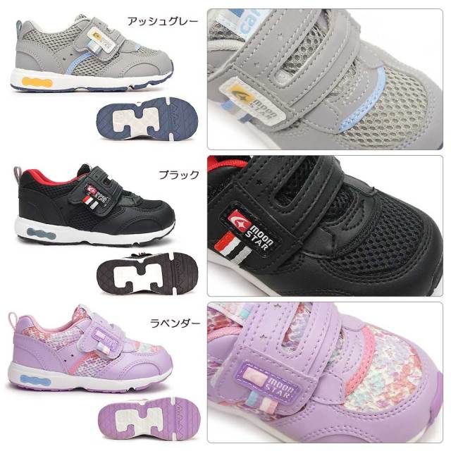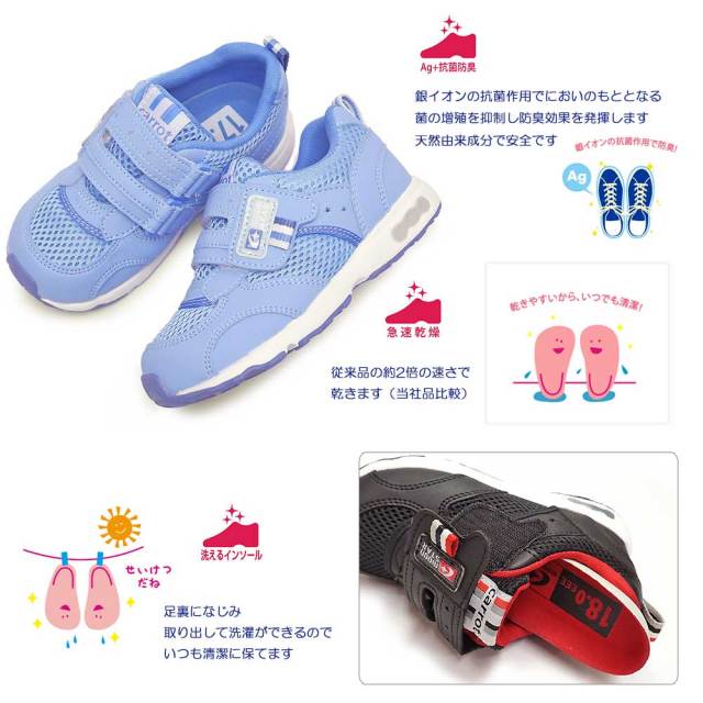 「子どもの足にいいことぜんぶ」の想いから生まれた機能シューズ「ムーンスター キャロット」の急速乾燥性に優れた幅広「3E」シューズです。
