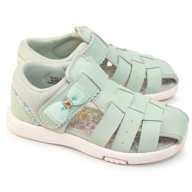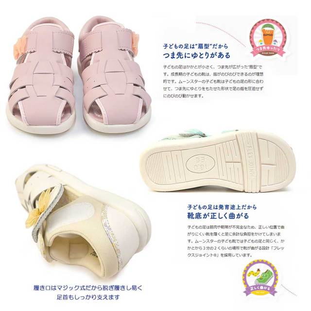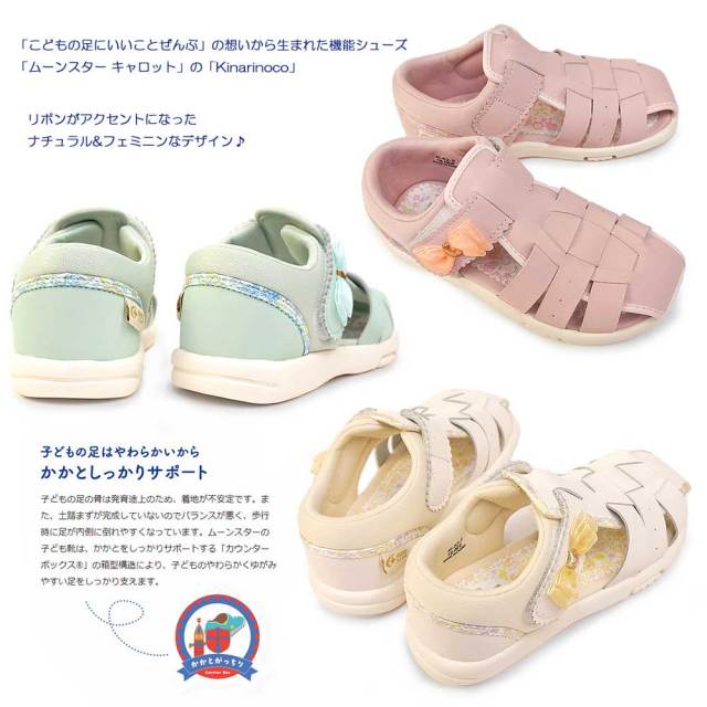 「子どもの足にいいことぜんぶ」の想いから生まれた機能シューズ「ムーンスター キャロット」の「Kinarinoco」シリーズのサンダルです。
