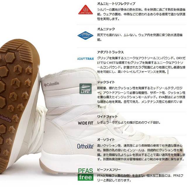 キルティングとファーライナーの女性らしいルックスに加えて、ウェビングテープでフィット感を高めたショートタイプ。超軽量でクッション性に優れた厚めのミッドソール「テックライト」と、ドライとウェットの両路面環境で高いパフォーマンスを発揮するアウトソール「アダプトトラックス」にアップグレードすることにより、極上の履き心地とさらなる安全性を実現しました。防水透湿機能「オムニテック」が雨や雪などの侵入とブーツ内のムレを防ぎ、熱反射保温機能「オムニヒートリフレクティブ」で、寒い日でも暖かい履き心地をキープします。日本人の足に馴染みやすいワイドシルエットを採用しており、幅広の方はもちろん、ゆったりと履きたい方にもおすすめです。幅、サイズ感:幅表示はありませんが、ややゆったりの作りです。