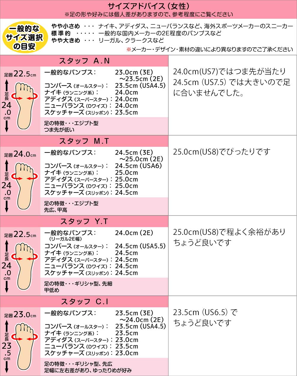 幅、サイズ感・・・幅表示(EE等)はありません(スタッフサイズ感参照)