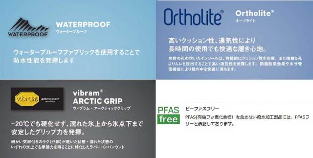 当シリーズ最大の特徴であるアウトソールは、積雪や凍結のある厳しい状況下でも安全に歩行できるように開発された、ヴィブラムオリジナルソールのヴィブラム「アークティックグリップ オルテライン」を採用しており、細かい突起付きのラグ(凸部)が摩擦力を利用して、安定したグリップ力を発揮します。コーディネートに取り入れやすいシンプルなデザインは、アウトドアシーンはもちろん、旅行やタウンユースと様々なシーンにフィットするアイテムです。