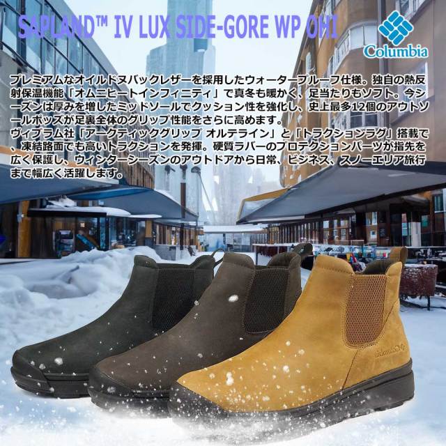 優れた保温性で暖かな履き心地と、様々な路面コンディションに対応したグリップ力をもつ、サップランドシリーズより、脱ぎ履きが楽なサイドゴアブーツ。今シーズンは、従来モデルに比べてミッドソールを厚くすることで快適性を向上。また、アッパーとミッドソールデザインのカーブを減らし、ストレートラインにすることで、ウィンターブーツらしいオーセンティックな雰囲気に仕上げました。アッパー素材は「LUX=Luxury」(豪華な、贅沢な、高級な)という商品名のとおり、レザーを採用しプレミアムな佇まいに仕上げました。さらに、ウォータープルーフ仕様で、雨や雪の日も安心です。ライナーには、熱反射保温機能「オムニヒートインフィニティ」のゴールドの裏地が、体の熱を反射するため、真冬の寒い日でもシューズ内を暖かく保ちます。インソールは高いクッション性と通気性に優れており、長時間履いていても疲れにくく、快適な履き心地を実現。