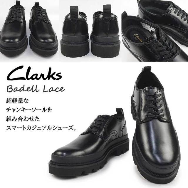 クラークスのアーカイブデザインと、超軽量なチャンキーソールを組み合わせたスマートカジュアルシューズ「バデルレース」。クラシックなブラックレザーアッパーに、クッション性の高いフットベッドが快適な履き心地を実現します。