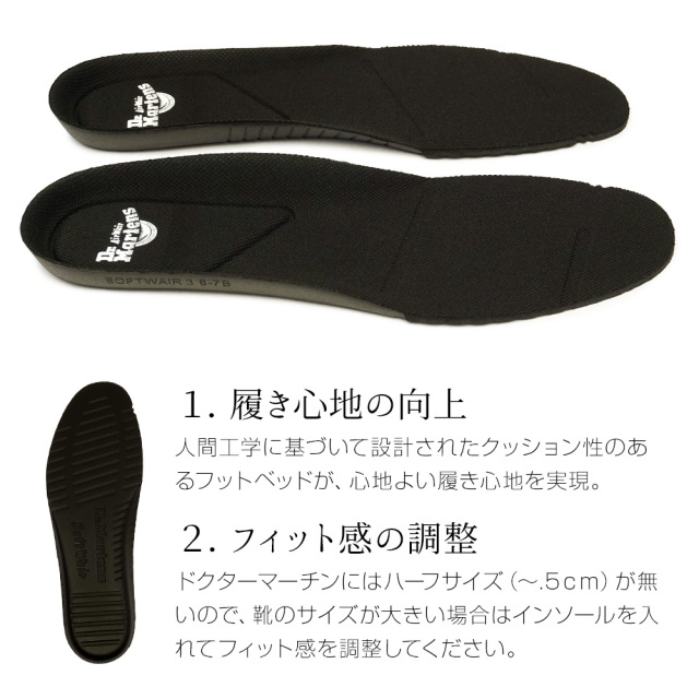 ドクターマーチンの靴はハーフサイズ(~.5cm)が無いのでちょうどいいサイズを選べない場合がありますが、インソールを入れることでフィット感を調整することが可能です。