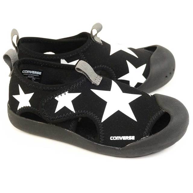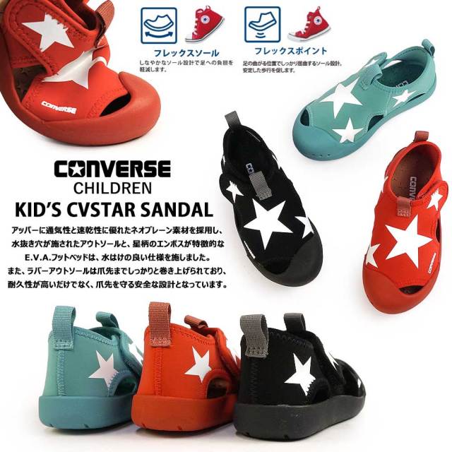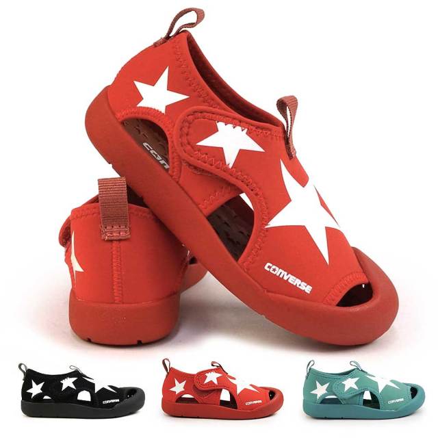 水辺にも街履きにも多彩なサマーシーンに活躍するキッズ向けサンダルモデル。コンバースらしい大きなスターをアッパーに大胆にあしらった、ワンベルトタイプのデザインで、脱ぎ履きしやすいデザインを採用。