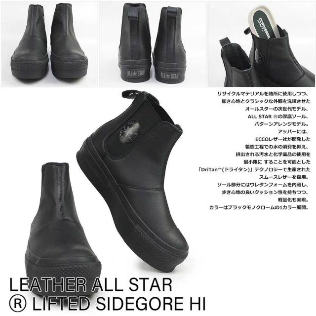 リサイクルマテリアルを随所に使用しつつ、履き心地とクラシックな外観を洗練させたオールスターの次世代モデル、ALL STAR Rの厚底ソール、パターンアレンジモデル。アッパーには、ECCOレザー社が開発した製造工程での水の消費を抑え、排出される汚水と化学薬品の使用を最小限に することを可能とした「DriTan(ドライタン)」テクノロジーで生産されたスムースレザーを採用。