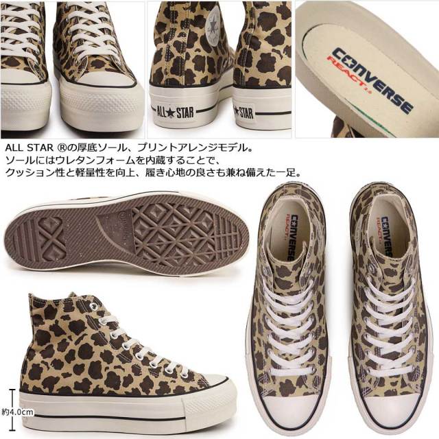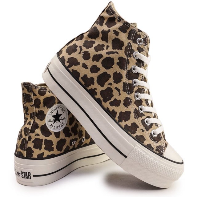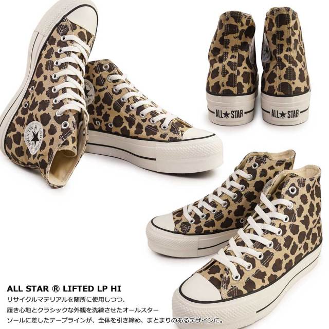 リサイクルマテリアルを随所に使用しつつ、履き心地とクラシックな外観を洗練させたオールスターの次世代モデル、ALL STAR Rの厚底ソール、プリントアレンジモデル。アッパーに、レパード柄を採用。