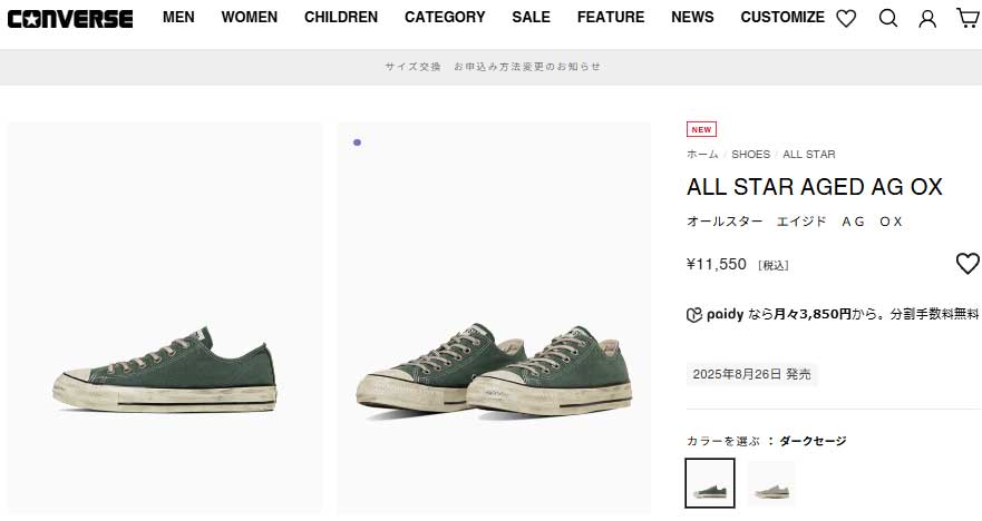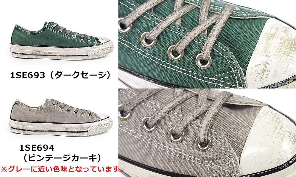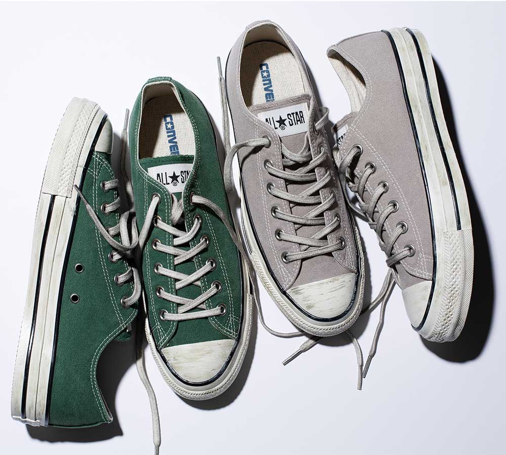 オールスター エイジドのディテールアレンジモデル。特殊な洗い加工とブリーチ加工を施したキャンバス素材をアッパーに採用。