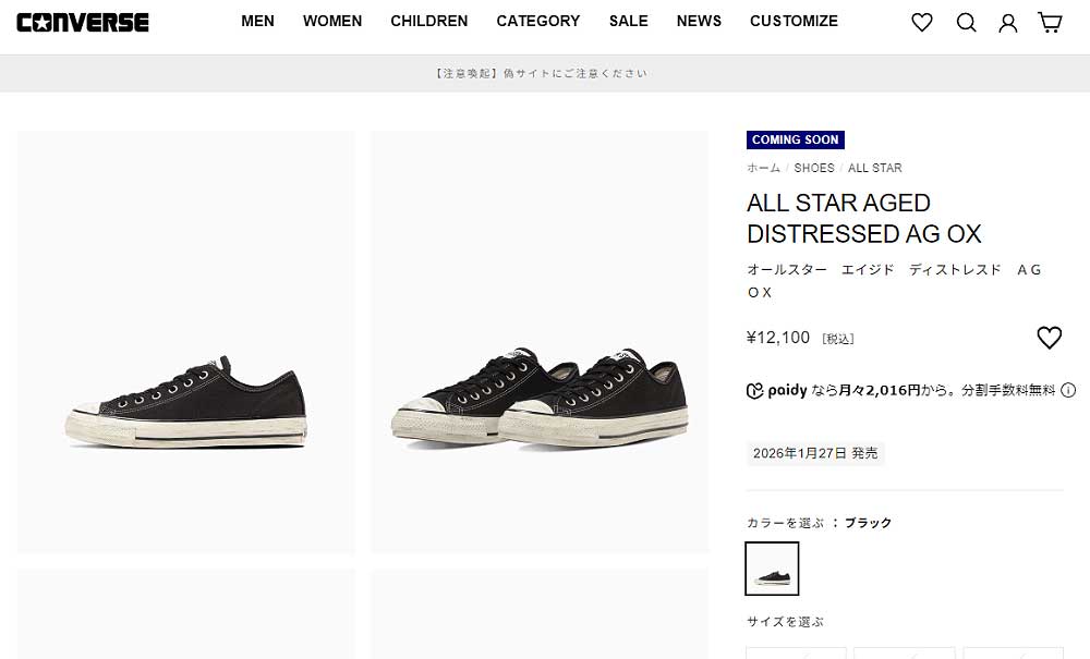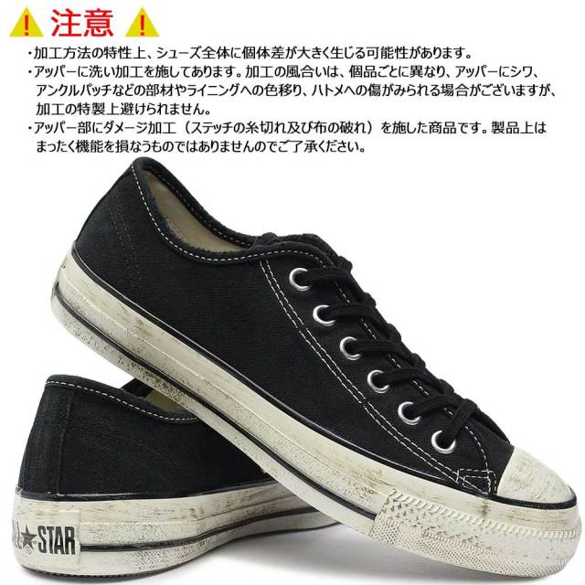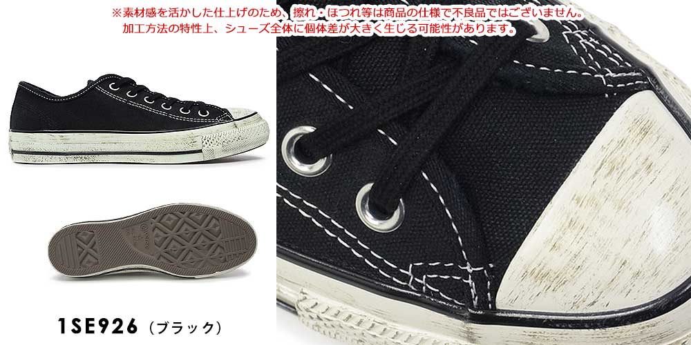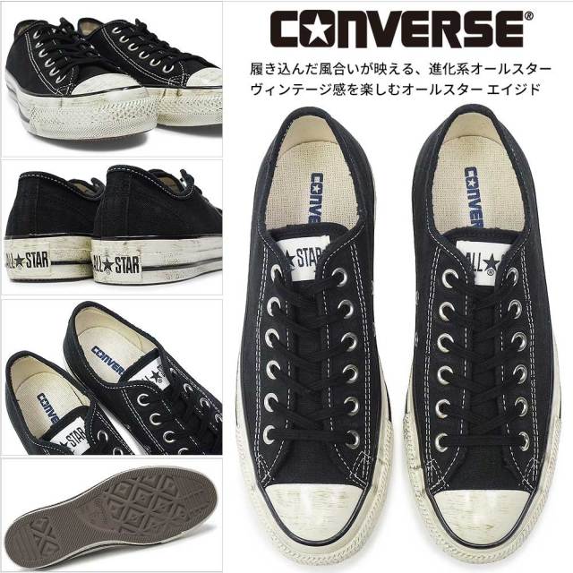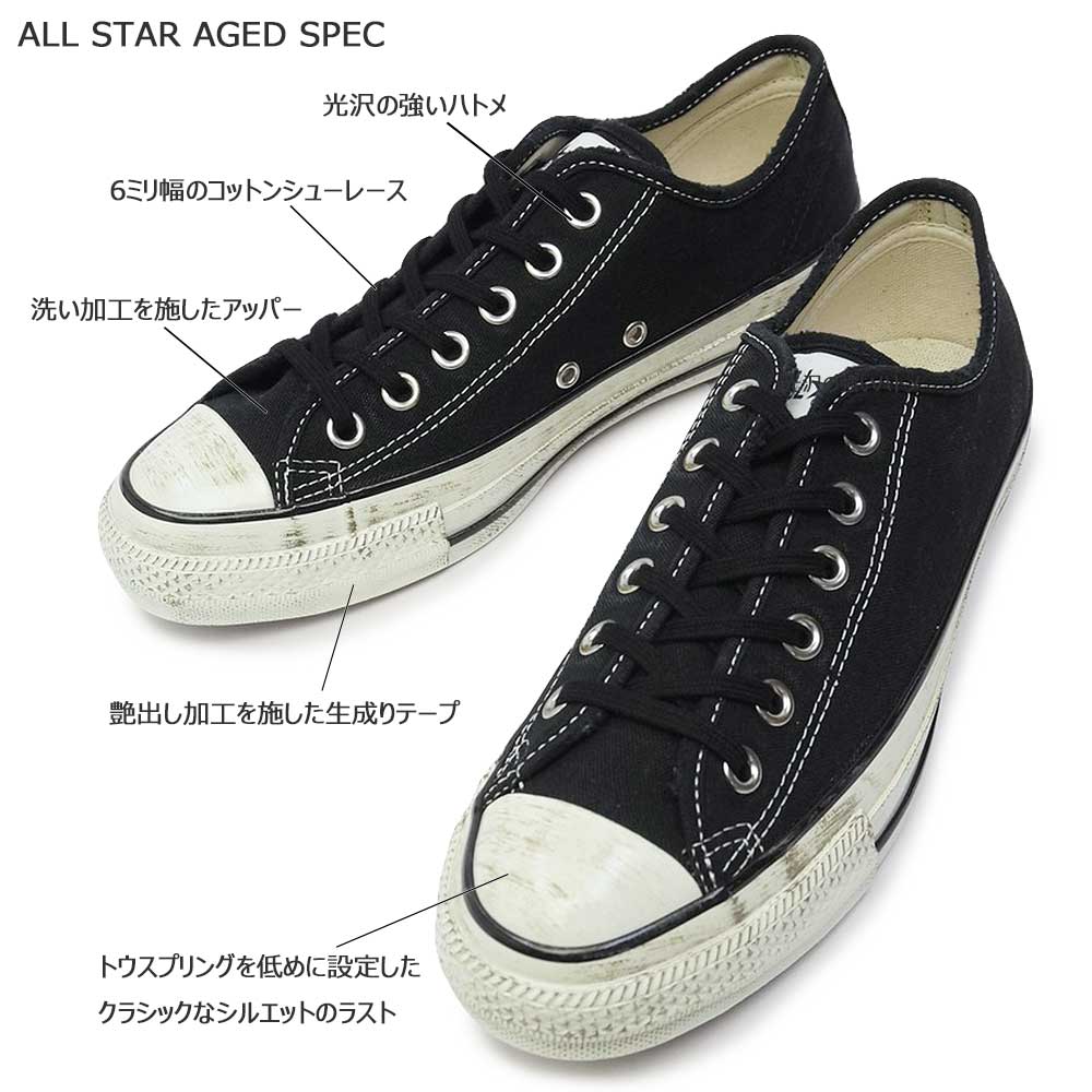 オールスター エイジドのディテールアレンジモデル。アッパーに特殊な洗い加工とブリーチ加工、テープとシューレースにエイジング加工を施したアイテム。