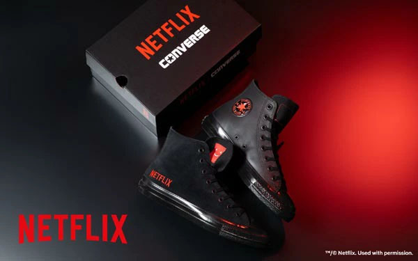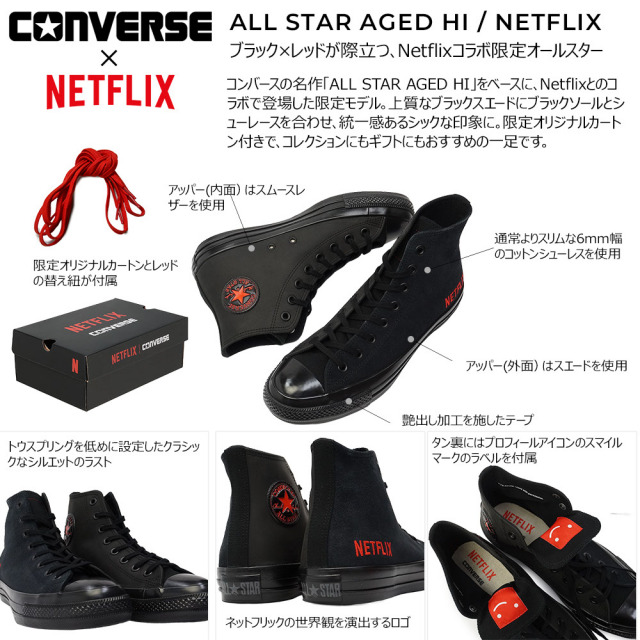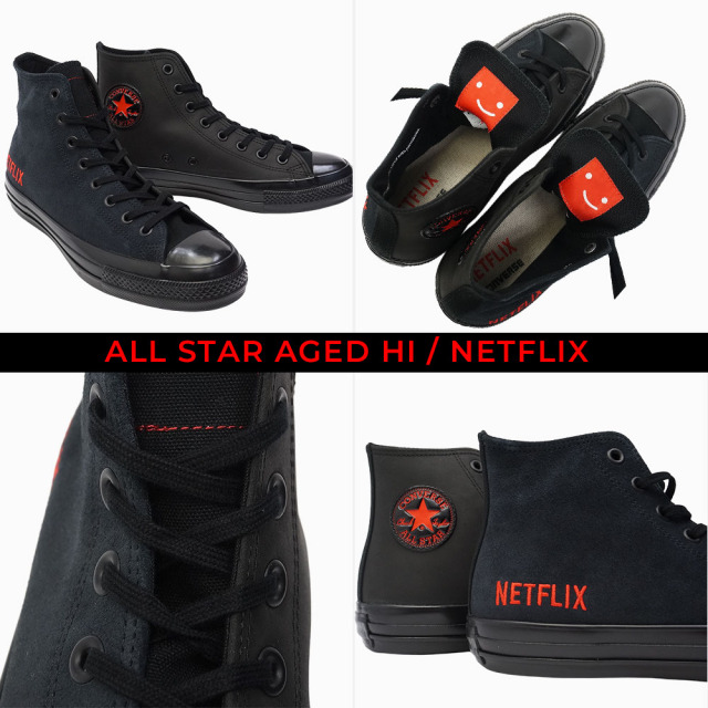 コンバースの名作「ALL STAR AGED HI」をベースに、Netflixとのコラボレーションで登場した特別仕様モデル。ブラックスエードのアッパーにブラックソールとシューレースを合わせ、統一感のあるクールな印象に仕上げました。右足サイドに刺繍された“NETFLIX”ロゴと、左足アンクルパッチのレッドカラーがさりげなく存在感を放ちます。ヴィンテージ感を演出するエイジド加工と、限定デザインのオリジナルカートンとレッドの替え紐が付属。普段使いはもちろん、コレクションやギフトにも最適な一足です。カラーはブラックの1カラー展開。