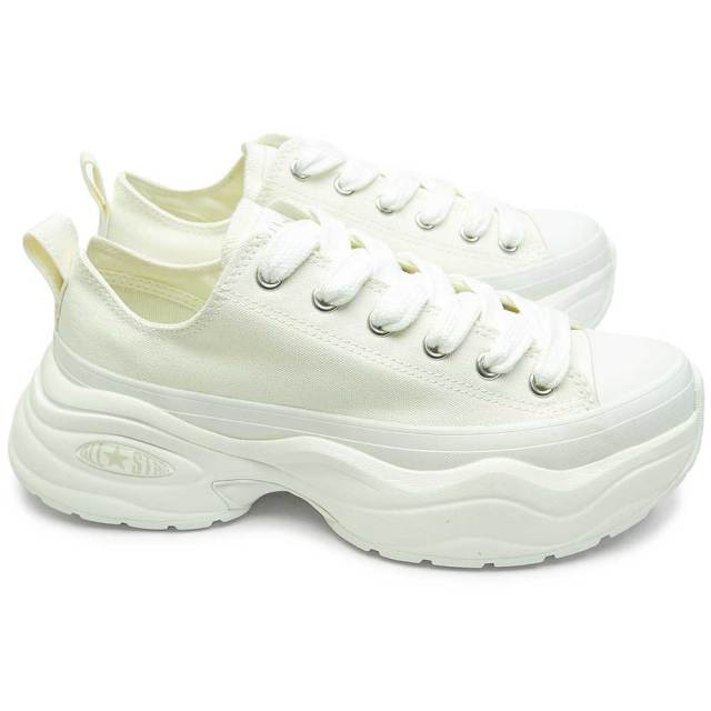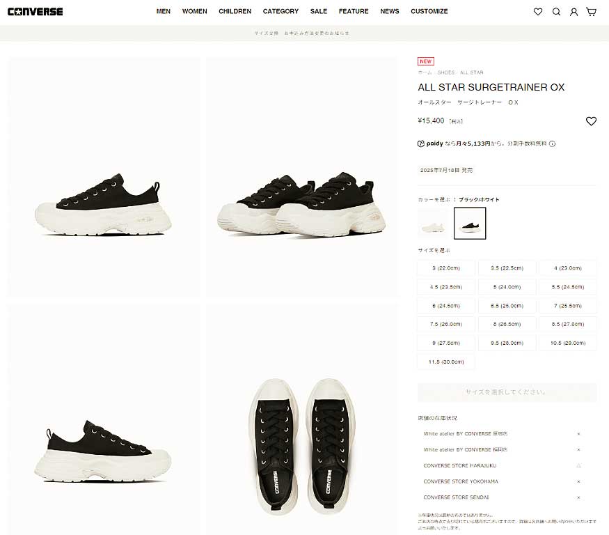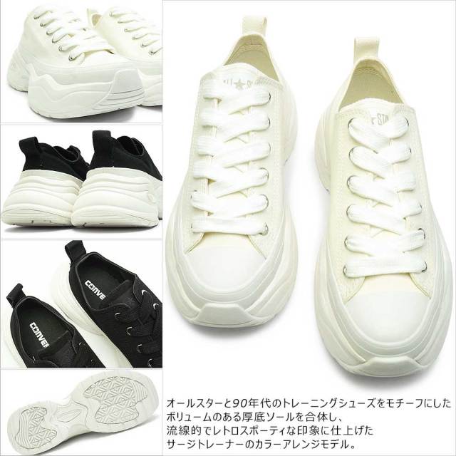 オールスターと90年代のトレーニングシューズをモチーフにしたボリュームのある厚底ソールを合体し、流線的でレトロスポーティな印象に仕上げたサージトレーナーのカラーアレンジモデル。ボリューミーなソールに相性のよいファットシューレースがポイント。