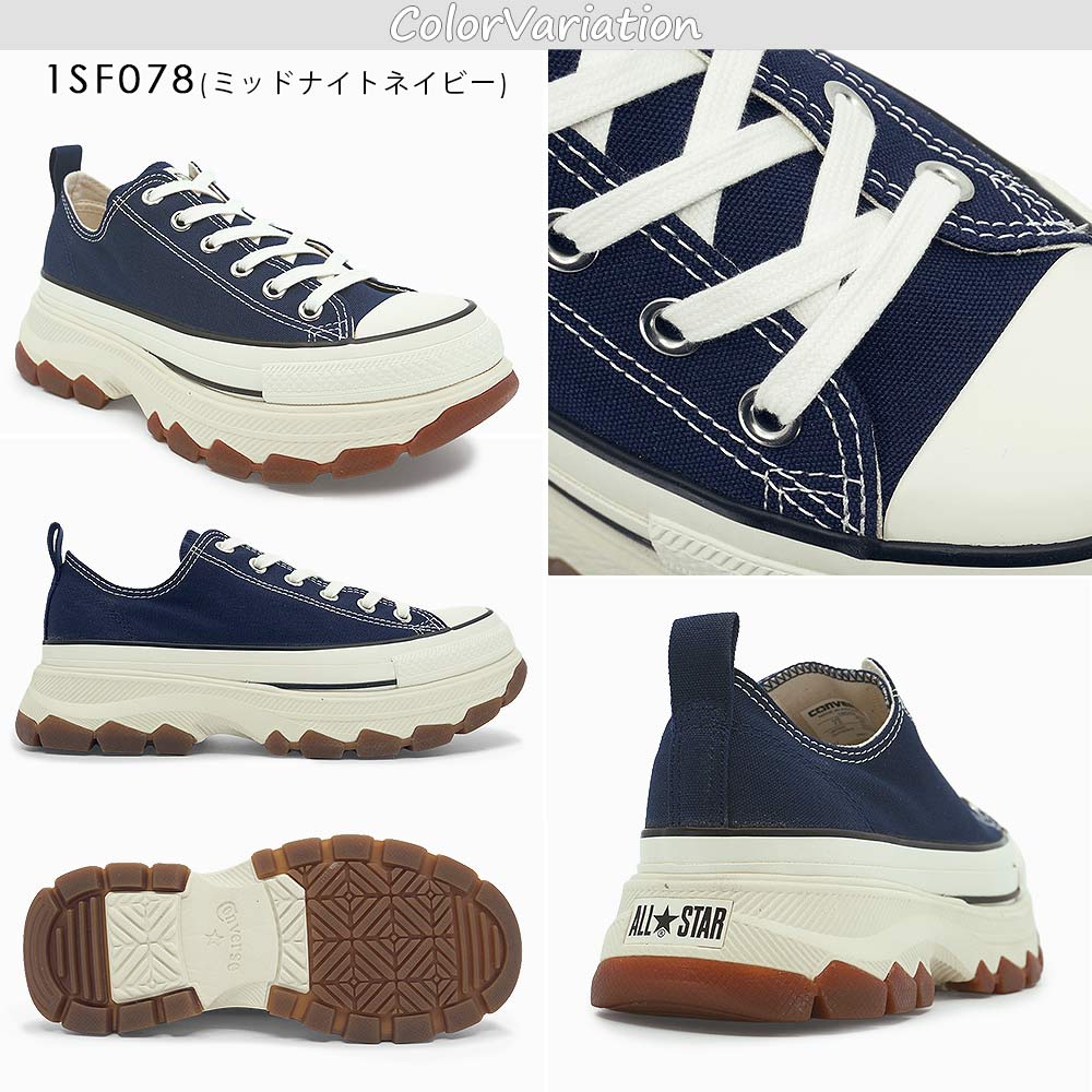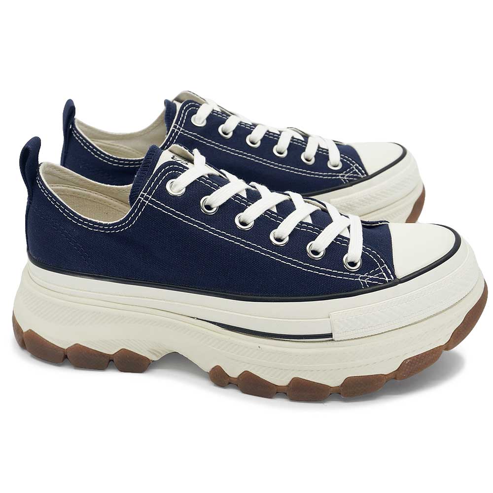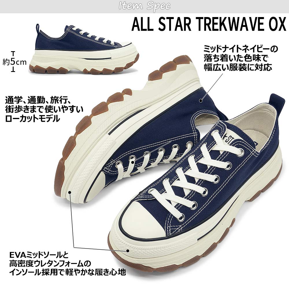 オールスターの定番スタイルに、トレッキングシューズをモチーフにしたボリュームのあるアウトソールを合体した、トレックウエーブのカラーアレンジモデル。ミッドソールにE.V.A.、インソールに高密度ウレタンフォームとラバースポンジを採用することで優れた履き心地を実現。