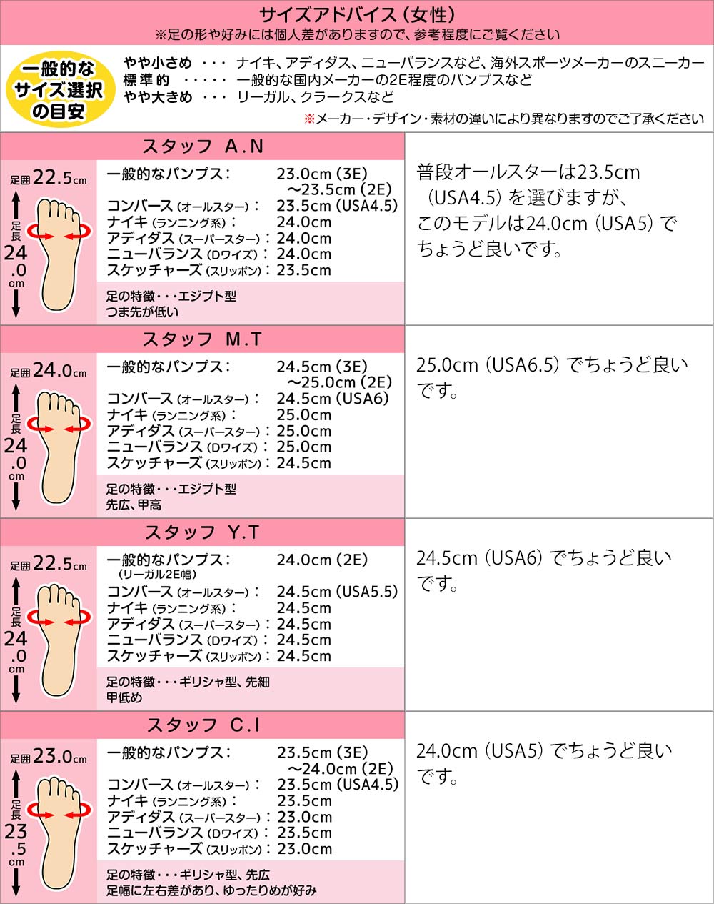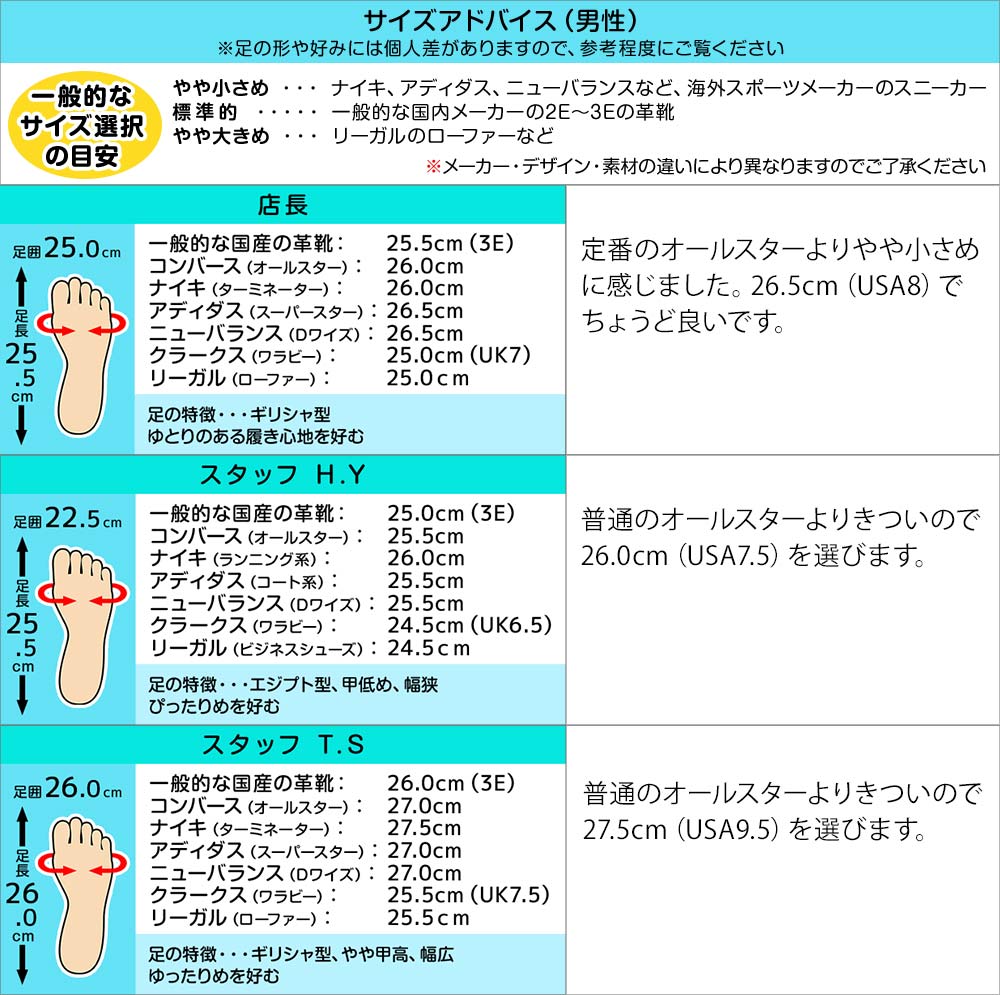 幅、サイズ感・・・オールスターは男性用(USAサイズ6以上)はやや小さめ、女性用(USAサイズ5.5以下)は標準的大きさ。