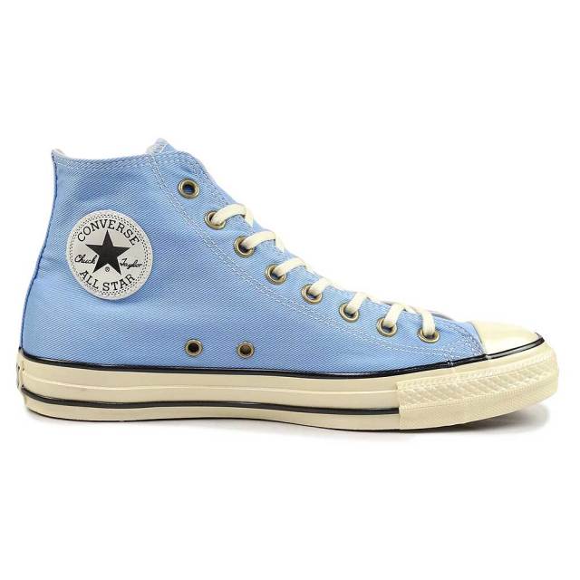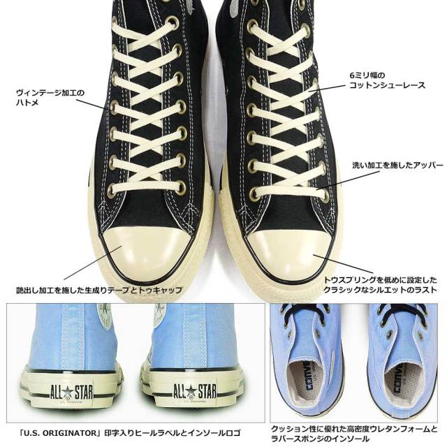 「U.S. ORIGINATOR」スペックを搭載したオールスターの素材アレンジモデル。古着のワークウエアをモチーフにまるで履き込んでアタリの出たような特殊な洗い加工とブリーチ加工を施したツイル素材をアッパーに採用。