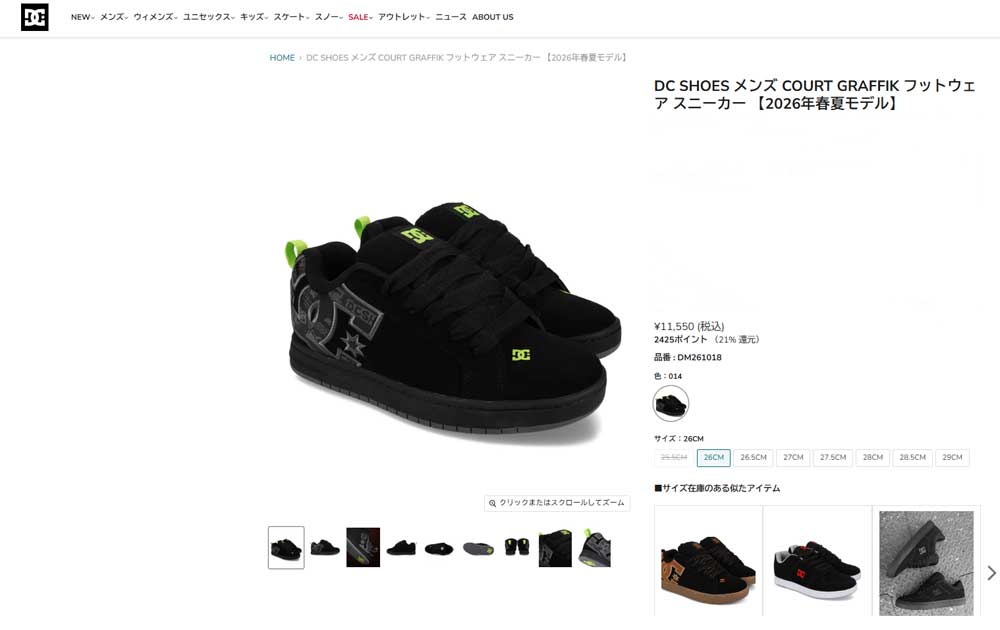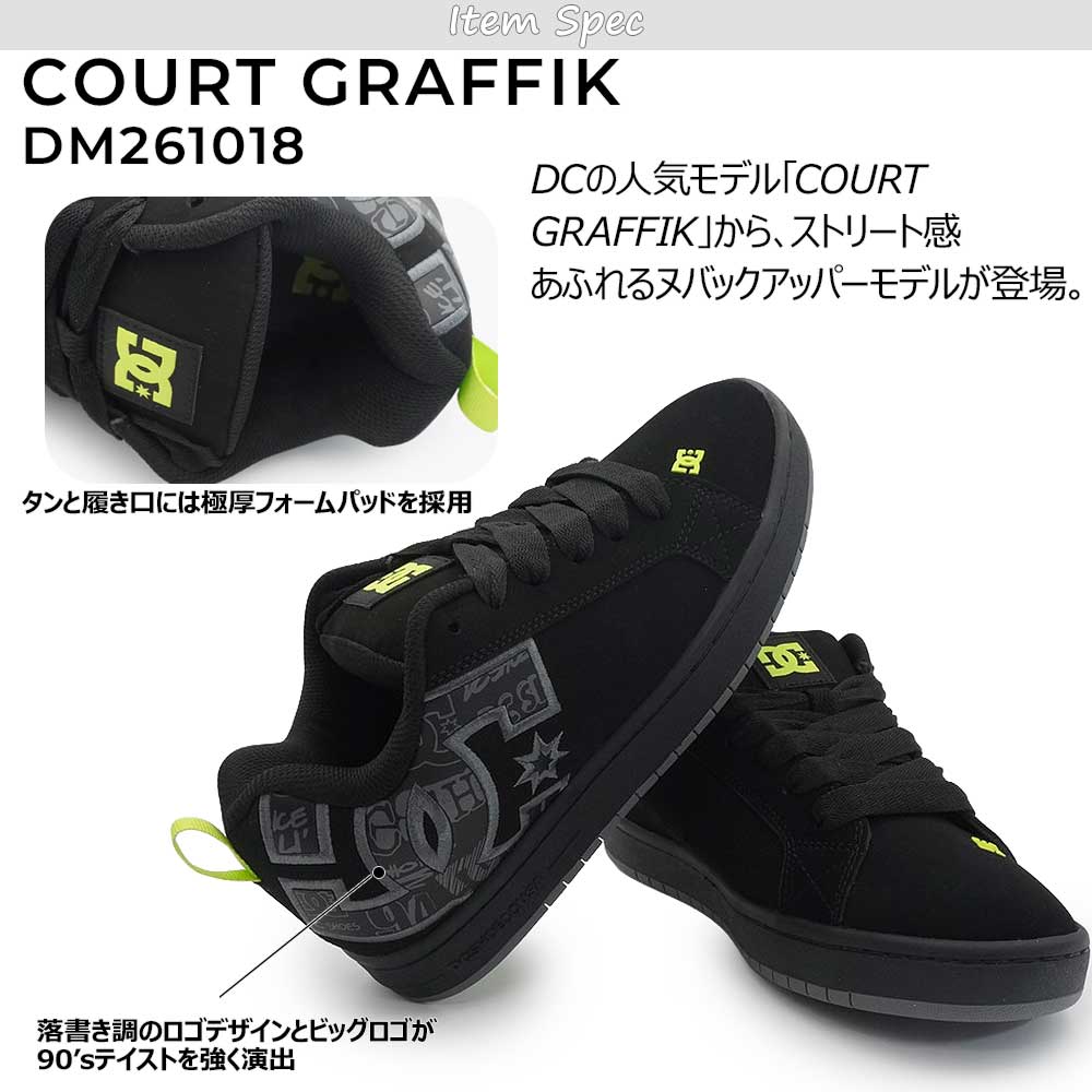 ファットなシルエットとDCビッグロゴが90’sストリートスタイル全開のカップソールシューズCOURT GRAFFIKから、オールヌバックアッパーに落書き調のロゴをあしらったデザインが登場。タンと履き口に施した極厚フォームパッドにより快適な履き心地に。さらに、軽量のメッシュタンと通気孔が通気性をアップさせる。幅、サイズ感・・・幅表示なし(ページ下部弊社スタッフサイズ感参照)