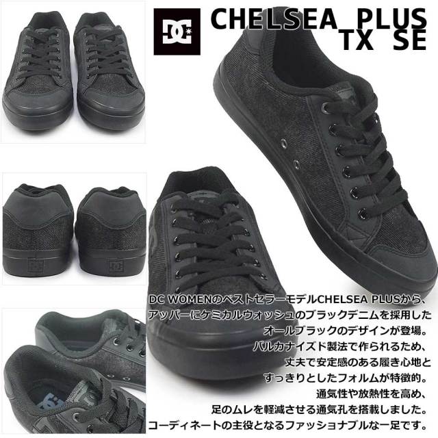 DC WOMENのベストセラーモデルCHELSEA PLUSから、アッパーにケミカルウォッシュのブラックデニムを採用したオールブラックのデザインが登場。バルカナイズド製法で作られるため、丈夫で安定感のある履き心地とすっきりとしたフォルムが特徴的。