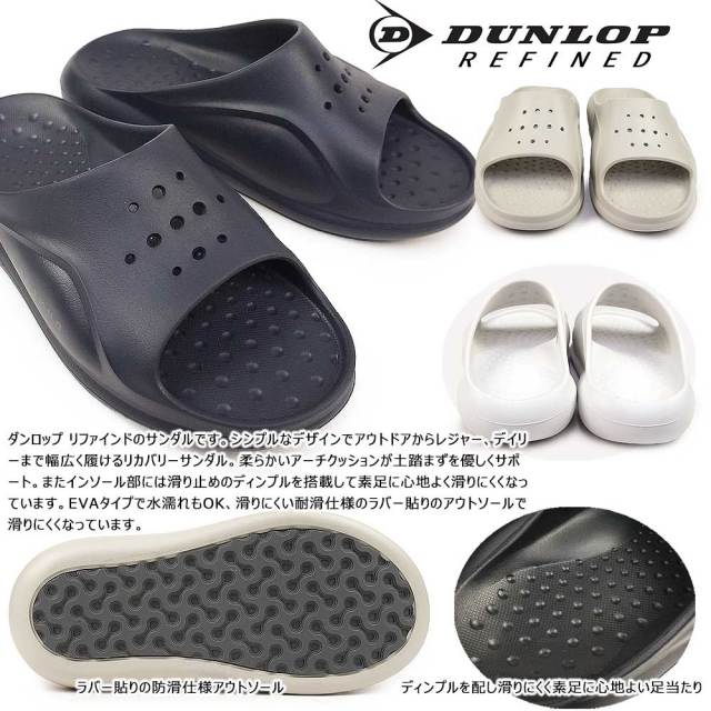 ダンロップ リファインドのサンダルです。シンプルなデザインでアウトドアからレジャー、デイリーまで幅広く履けるリカバリーサンダル。柔らかいアーチクッションが土踏まずを優しくサポート。またインソール部には滑り止めのディンプルを搭載して素足に心地よく滑りにくくなっています。EVAタイプで水濡れもOK、滑りにくい耐滑仕様のラバー貼りのアウトソールで滑りにくくなっています。幅、サイズ感・・リカバりーサンダルの為、足裏全体がゆったりとサンダル表面に乗るサイズ感で履けるように作られています。ゆったりしたサイズ感で大き目の作りです。