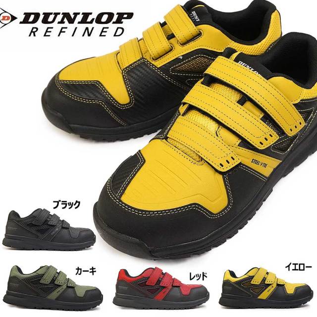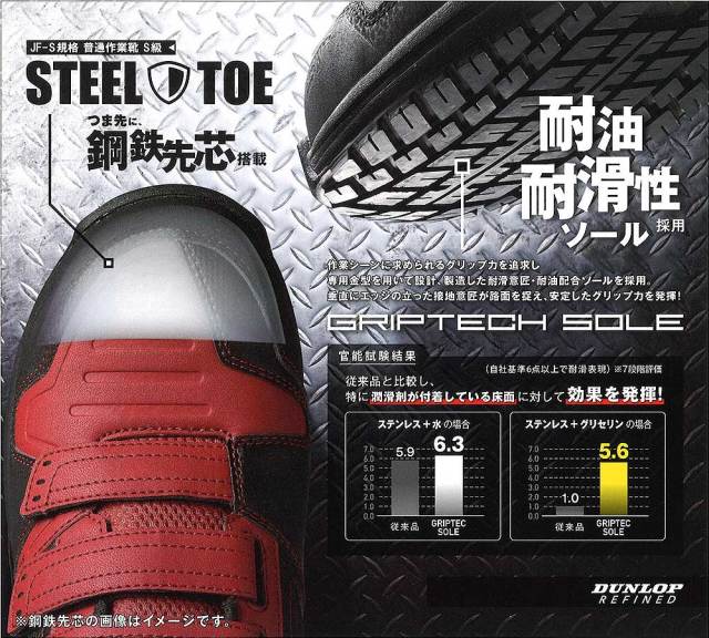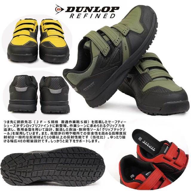 つま先に鋼鉄先芯(JF-S規格 普通作業靴S級)を搭載したダンロップリファインドのリニューアルモデル。4E・幅広モデルらしく従来よりややゆったりしたサイズ感になりました。作業シーンに求められるグリップ力を追求し、専用金型を用いて設計、製造した耐油・耐滑性ソール「グリップテックソール」を採用。夜間歩行時の安全性を高める反射材付きです。軽量性や通気性はもちろん、機能面でもしっかり足下をサポートします。(高熱に対しては耐熱性がありませんので溶接作業などには不向きです。)マジックタイプで着脱も容易。カーボン調のアッパーが足元に映える働く人を応援するセイフティーシューズ。幅、サイズ感・・4Eで幅広モデルのためややゆったりサイズです。