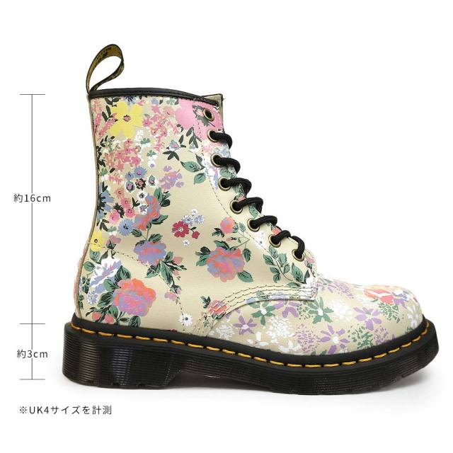 ドクターマーチンのアイコニックなヒールループとイエローステッチウェルトと、可愛い印象のフラワープリントが印象的なレースアップブーツです。