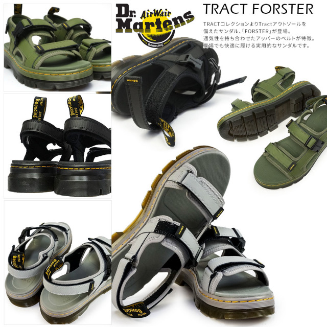 ドクターマーチンTRACTシリーズに現代的なデザインのサンダル「FORSTER」が新登場。耐久性のあるポリエステル、リップストップ、ウェビングを使用した軽量かつ頑丈なTractアウトソールを備えたストラップサンダル。