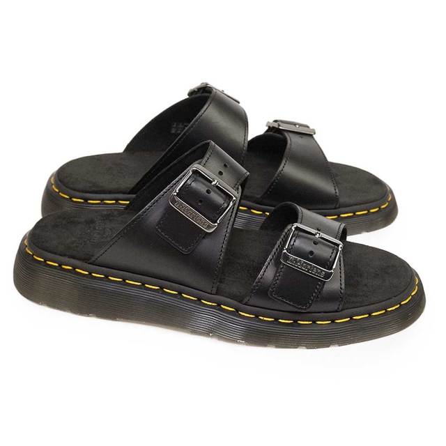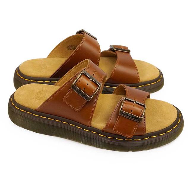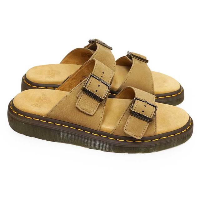 ラクに履けて、どんなスタイルにも合わせやすいスライドサンダル。2本のバックルでフィット感も調整可能。スエード素材のフットベッドで快適な履き心地を提供。疲れにくいフラットソールで普段使いやリゾートスタイルにぴったり。ブランド名の入ったバックルがアクセント。マーチンならではのイエローステッチがウェルトに効いてるデザインもポイント。幅、サイズ感・・・甲まわりがやや低めのサイズ感ですがベルトで調節できます