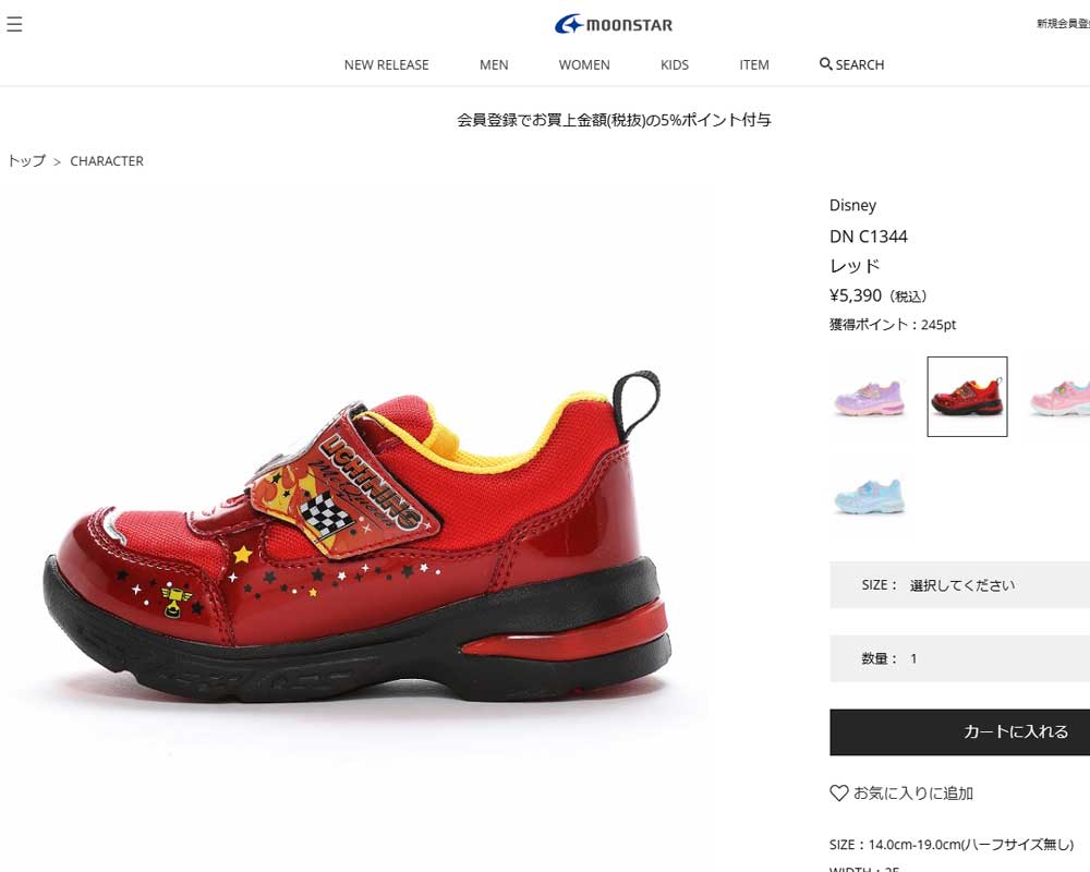 甲バンドの発光部分がキャラクターのモチーフを象ったデザインで、おもちゃ感覚の楽しい一足。