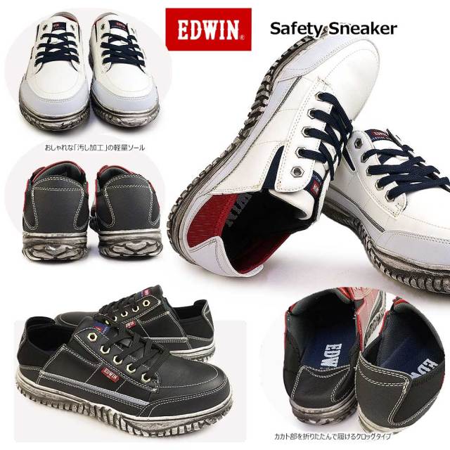かかとを折りたたんでも履けるクロッグタイプでサンダル代わりに気軽にはけるファンション性と機能性を兼ね備えたエドウィンのセイフティースニーカー。つま先に鉄芯を搭載しつま先を衝撃から保護。アウトソールはビンテージな汚し加工を施し軽量ミッドソールにラバーを貼り付け防滑性を高めました。倉庫作業、運送業、軽作業にも最適なモデル。見た目とは裏腹の驚異の軽量化と実現し軽快なクッション性と両立した履き心地でフィット感も抜群。安全スニーカーながらおしゃれなカラーリングでジーンズ、チノパンなどにも相性のよいミュールスニーカー。
