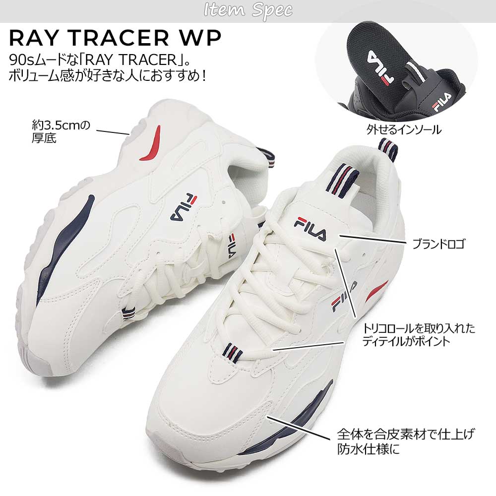 FILAのヘリテージを象徴する名作「RAY TRACER」に、待望のウォータープルーフモデルが登場。 FILAらしいトリコロールカラーをまとったクラシックなルックスに、防水性を備えた、現代の都市生活にマッチする使いやすいスニーカーです。 オーバーレイを重ねた立体感のあるデザインが特徴で、軽量なEVAミッドソールが快適なクッション性を発揮し、長時間の歩行もサポートします。 90sテイストのレトロなデザインと、ハイテクスニーカーのような履き心地、さらに防水機能を融合したRAY TRACER WP。 デニムやスウェットパンツに合わせたストリートスタイルはもちろん、雨の日のセットアップのハズしにも活躍。 機能性もファッション性も妥協したくない方におすすめの一足です。幅、サイズ感・・・幅表示なし(ページ下部弊社スタッフサイズ感参照)