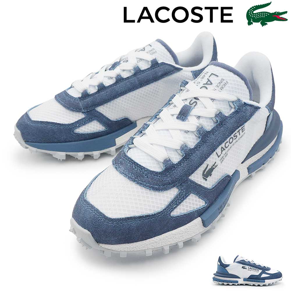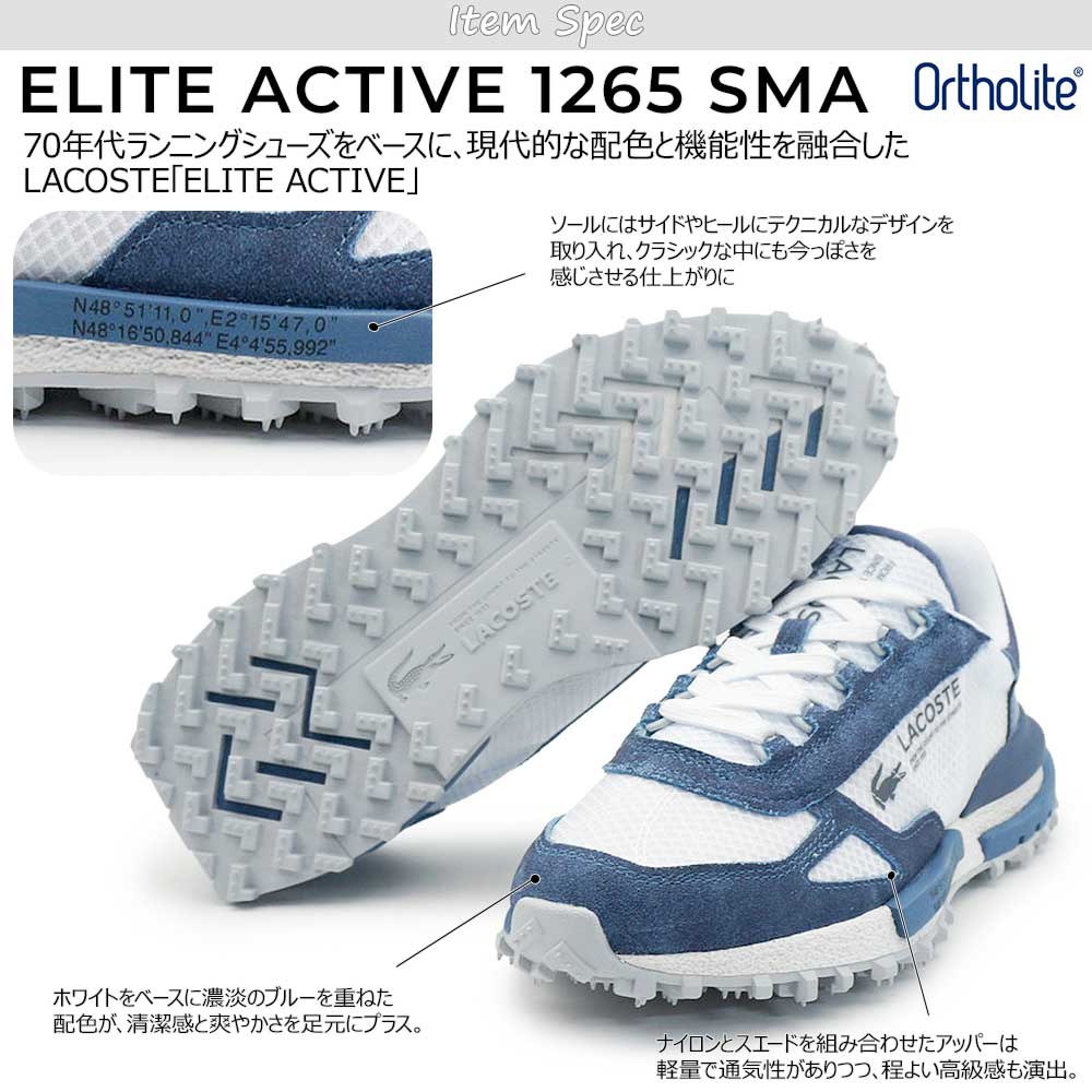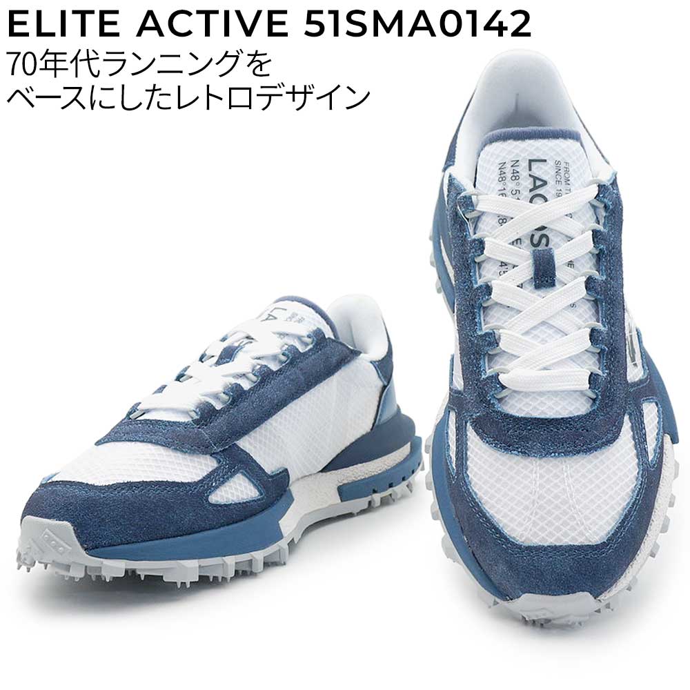 70年代のランニングシューズをベースにした、LACOSTEのレトロスニーカー「ELITE ACTIVE」。ナイロン×スエードの異素材アッパーが軽やかさと上質感を両立し、ホワイト×ブルーの爽やかな配色が足元をクリーンに演出。