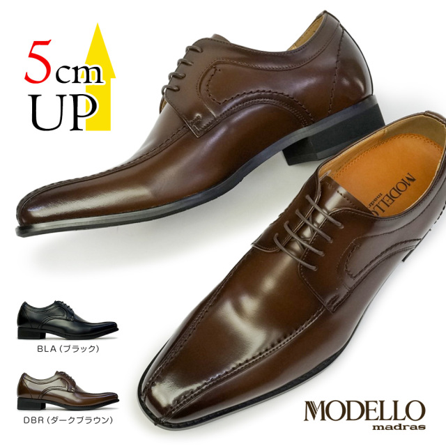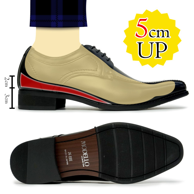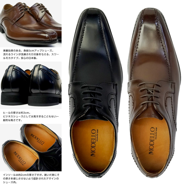 ヒールとインソールで約5cm背が高くなるビジネスドレスシューズ。脚長でスタイリッシュに見える効果が期待できます。