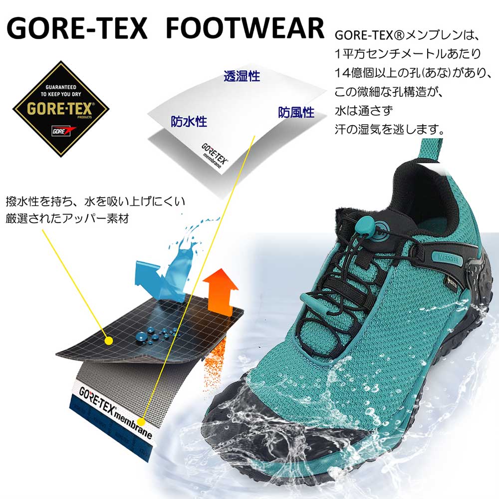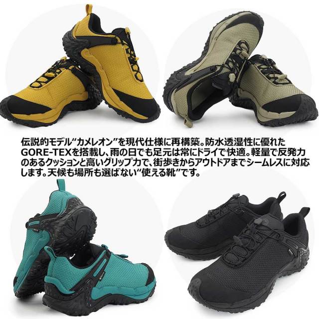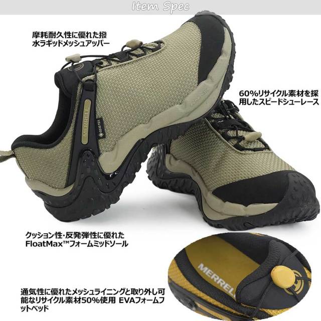 MERRELL CHAMELEON STORM REDUX JAPAN GORE-TEX ・ 摩耗耐久性に優れた撥水ラギッドメッシュアッパー ・ 業界随一の透湿防水性を誇るGORE-TEXR防水透湿メンブレン ・ 60%リサイクル素材を採用したスピードシューレース・ ・ エラスティックレースキーパー ・ 着地の安定性をサポートするTPUヒールカウンター ・ リサイクル素材100%のヒールプルタブ ・ 通気性に優れたメッシュライニング ・ 取り外し可能なリサイクル素材50%使用 EVAフォームフットベッド ・ リサイクル素材50%使用のメッシュフットベッドカバー ・ 天然由来成分でニオイを抑制するCleansport NXT? 防臭加工 ・ クッション性・反発弾性に優れたFloatMax?フォームミッドソール (相反する軽量性と耐久性(機能持続性)を両立させたサステナブルEVAフォーム) ・ ラバーアウトソール