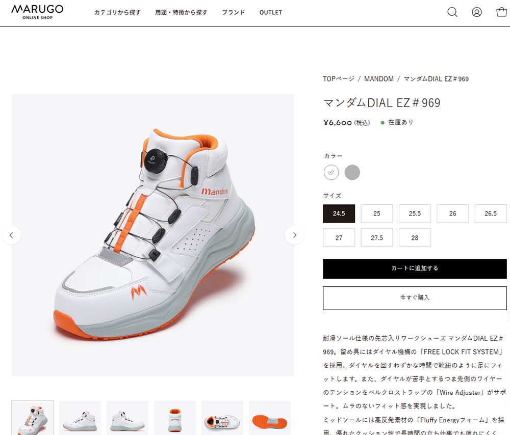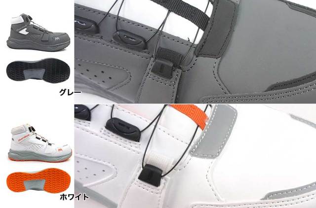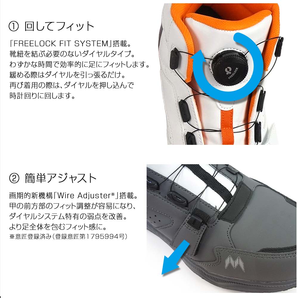 耐滑ソール仕様の先芯入りワークシューズのミッドカットモデル。フロントシュータン上部の留め具にはダイヤル機構の「FREE LOCK FIT SYSTEM」を採用。また、つま先側のベルクロストラップ「Wire Adjuster」を引っ張りワイヤーのテンションを調節し、ムラのないフィット感を実現。