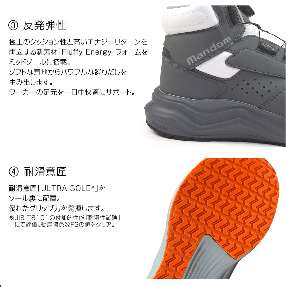 ミッドソールには高反発素材の「Fluffy Energyフォーム」を採用。優れたクッション性で長時間の立ち仕事でも疲れにくく、ソフトな着地からパワフルな蹴り出しを生み出し、足元を一日中快適にサポート。