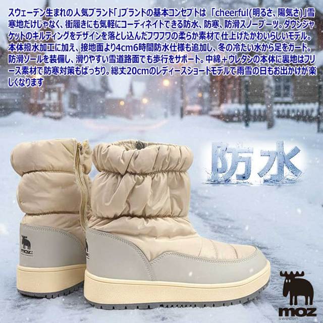 スウェーデン生まれの人気ブランド「」ブランドの基本コンセプトは 「cheerful(明るさ、陽気さ)」雪寒地だけじゃなく、街履きにも気軽にコーディネイトできる防水、防寒、防滑スノーブーツ。ダウンジャケットのキルティングをデザインを落とし込んだフワフワの柔らか素材で仕上げたかわいらしいモデル。本体撥水加工に加え、接地面より4cm6時間防水仕様も追加し、冬の冷たい水から足をガード。防滑ソールを装備し、滑りやすい雪道路面でも歩行をサポート。中綿+ウレタンの本体に裏地はフリース素材で防寒対策もばっちり。総丈20cmのレディースショートモデルで雨雪の日もお出かけが楽しくなります
