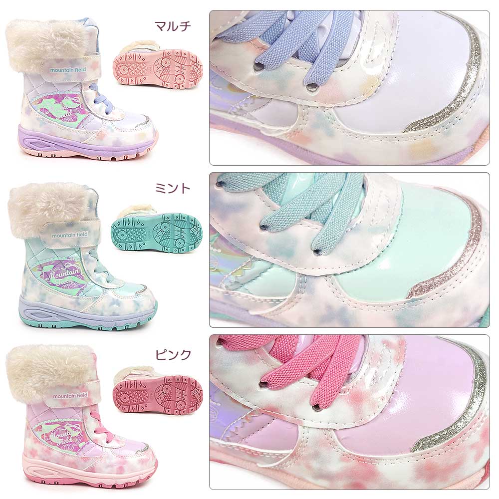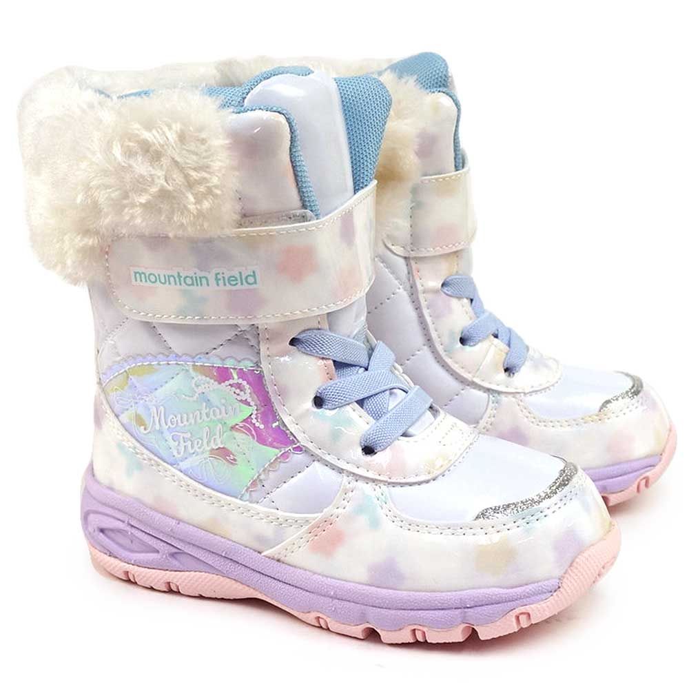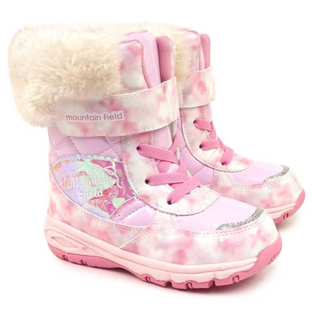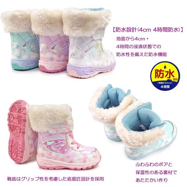 「マウンテンフィールド」のキッズ女児用ウィンターブーツです。雨雪時にもおすすめな「防水設計(4cm4時間防水)」機能を搭載し、靴底はグリップ性を考慮した底意匠設計です。