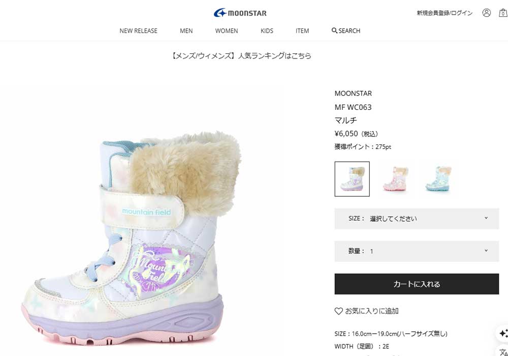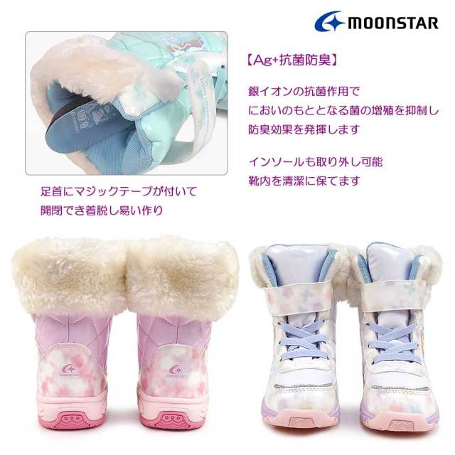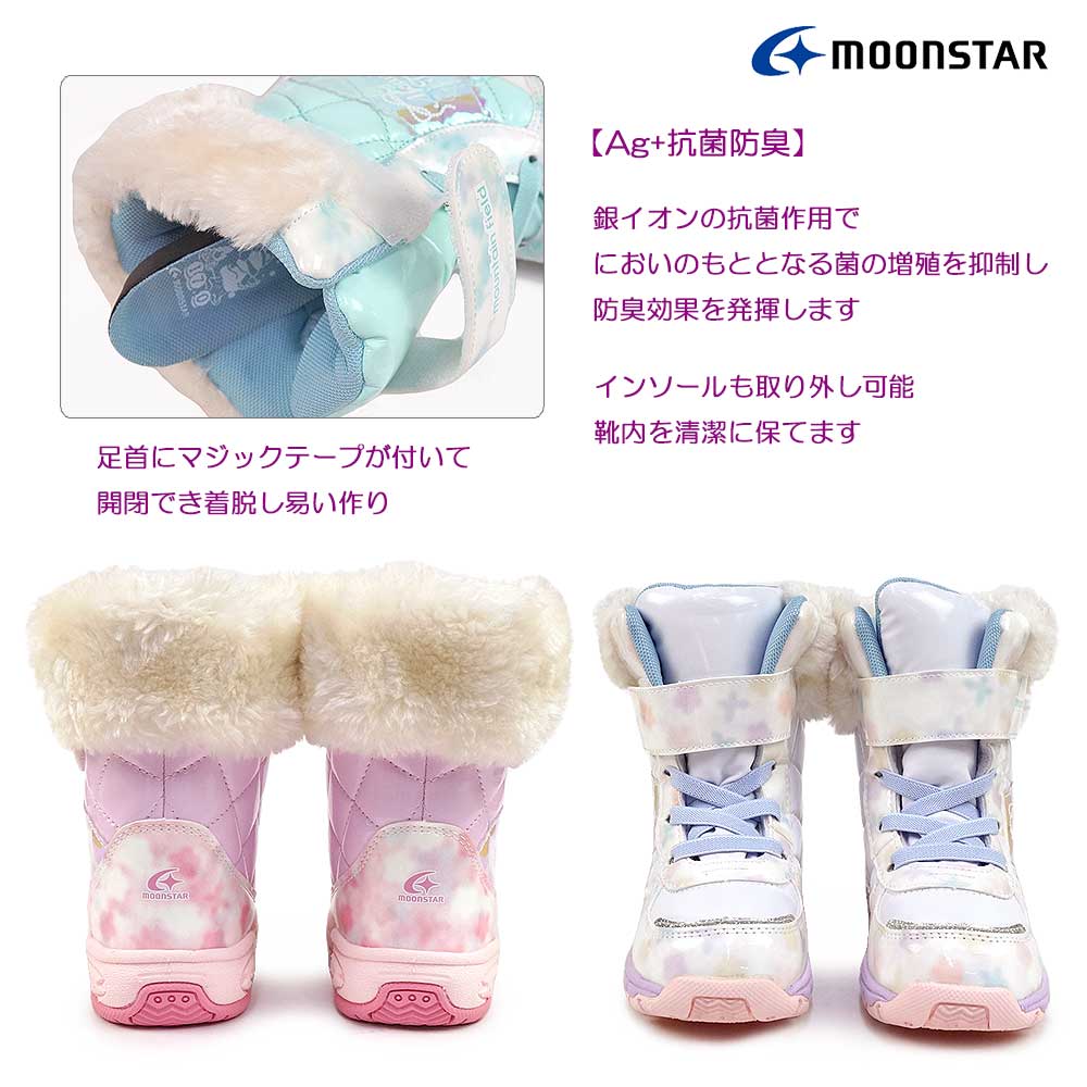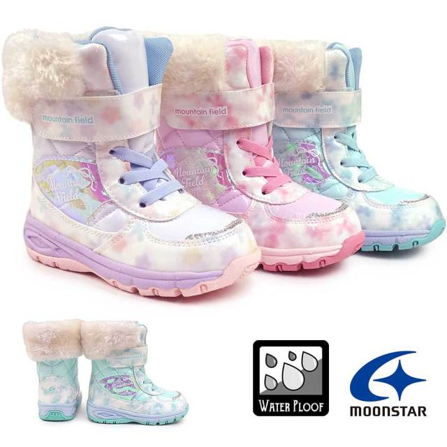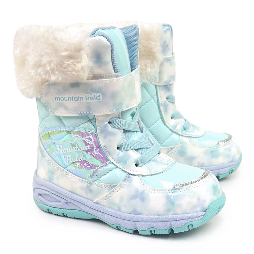 「マウンテンフィールド」のキッズ女児用ウィンターブーツです。雨雪時にもおすすめな「防水設計(4cm4時間防水)」機能を搭載し、靴底はグリップ性を考慮した底意匠設計です。