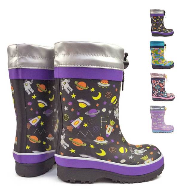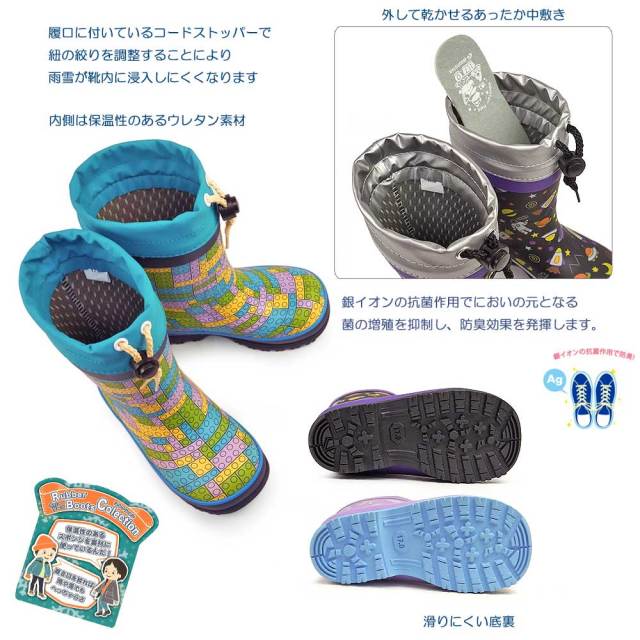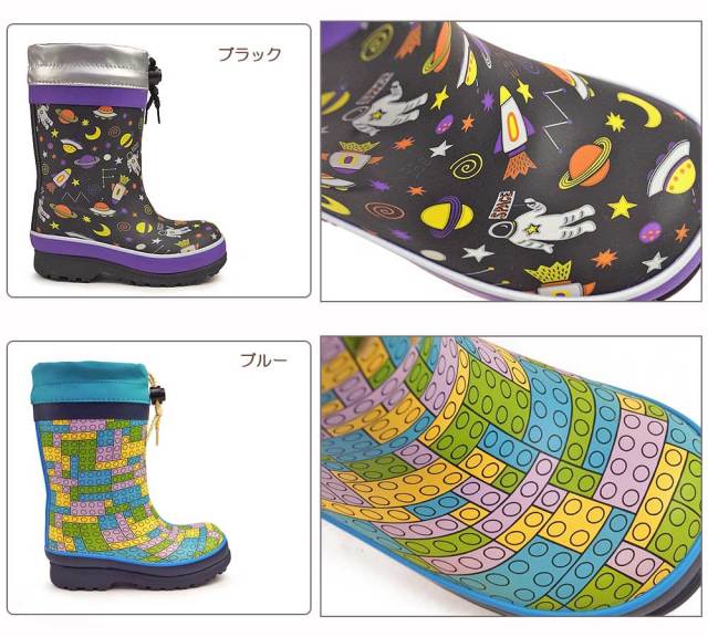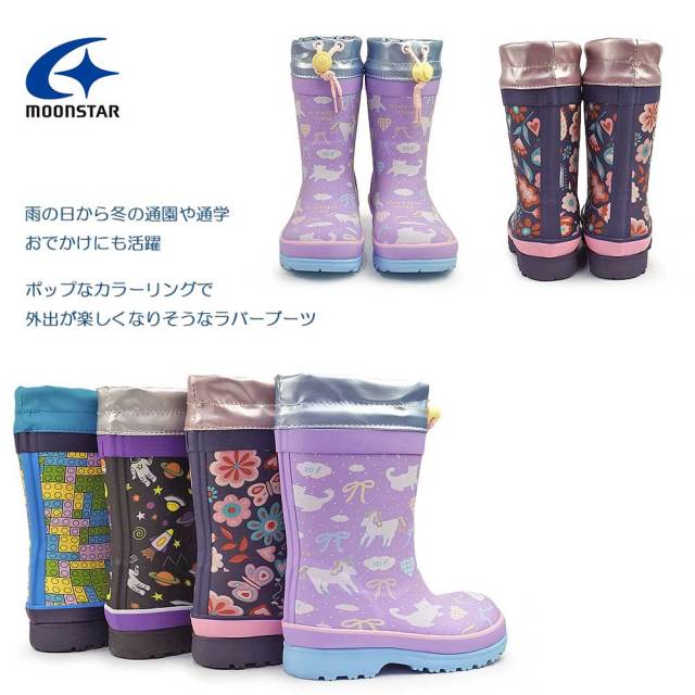 ポップなカラーリングで、雨の日から冬の通園や通学、おでかけにも活躍するラバーブーツです。