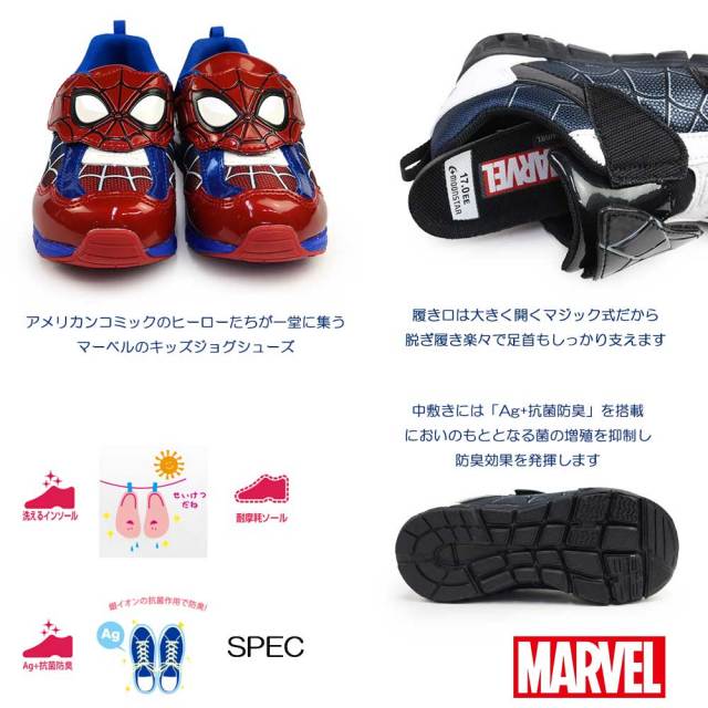 アメリカンコミックのヒーローたちが一堂に集うマーベルのキッズジョグシューズです。色によって人気のキャラクターを表現したインパクト大の一足です。レッドは「スパイダーマン」、ブラックは「シンビオート」です。【洗えるインソール】足裏になじみ、取り出して洗濯ができるので靴内を清潔に保てます。