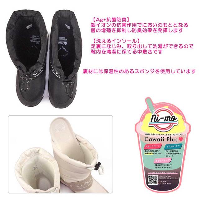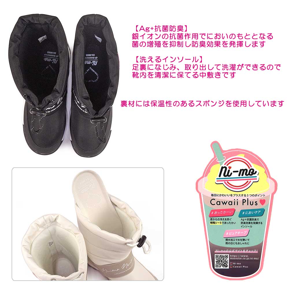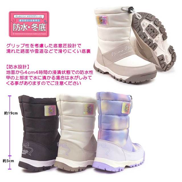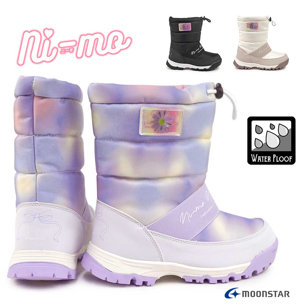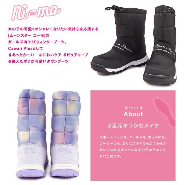 女の子のかわいく、オシャレになりたい気持ちを応援する「ムーンスター ニーモ」のガールズ向けウィンターブーツです。雨雪時にもおすすめな「防水設計(4cm 4時間防水)」機能を搭載し、靴底はグリップ性を考慮した底意匠設計で濡れた路面でも滑りにくい作り。(完全防水でなありません)