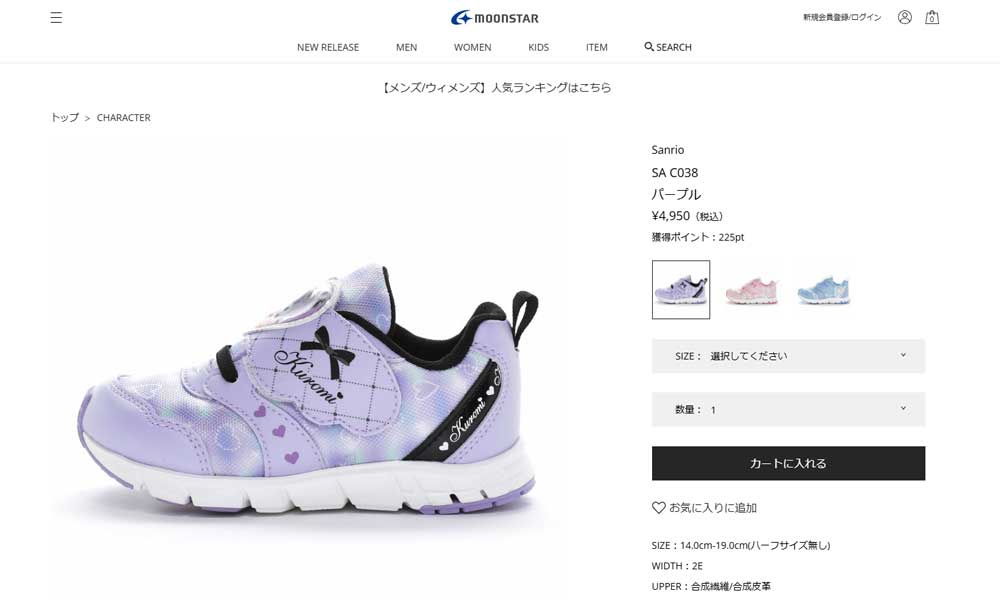 サンリオのキッズジョグシューズです。脱ぎ履きが簡単なゴム紐×バンドタイプです。