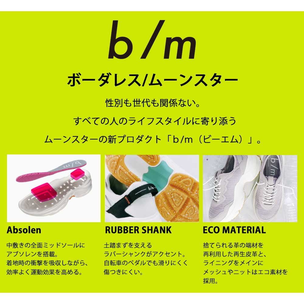より良い快適さと遊び心がコンセプトの新たなプロダクトライン「b/m(ビーエム)」です。ムーンスターが長年追求したコンフォートシューズをルーツに、多様化するニューノーマルな暮らしに向けて新たなスタイルを提案、人と地球にやさしいプロダクトを目指します。
