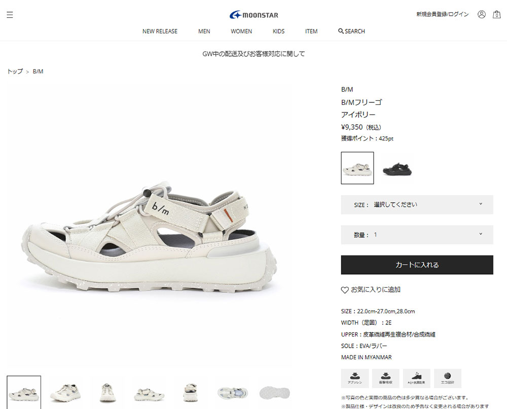 素材:アッパー:合成皮革/合成繊維、ソール:EVA/ラバー