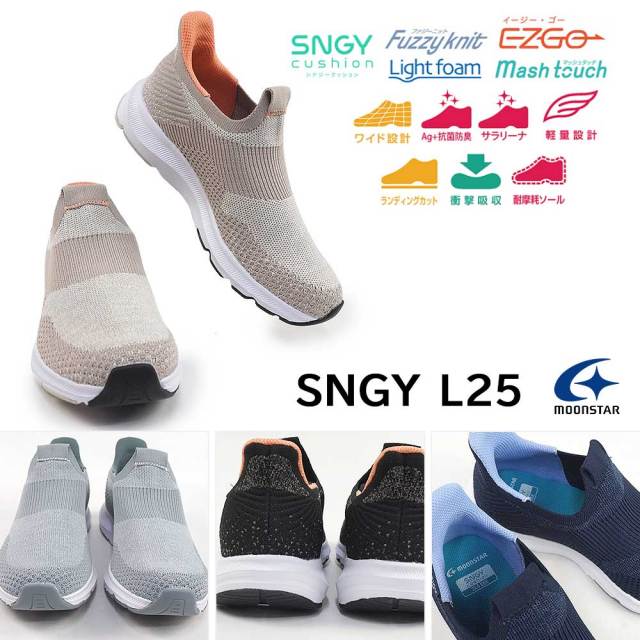 手を使わずスポッと履けるムーンスターのハンズフリースニーカー軽さと柔らかさが魅力のクッション性に優れたSNGYcushion(シナジークッション)シリーズです。