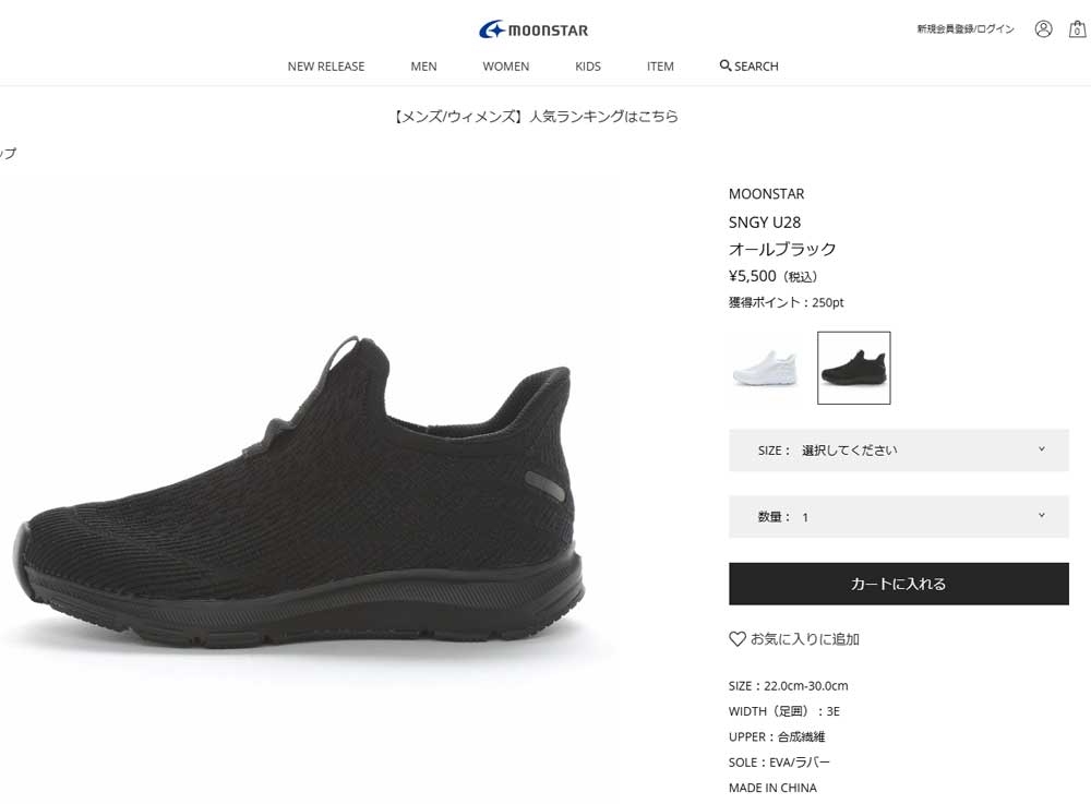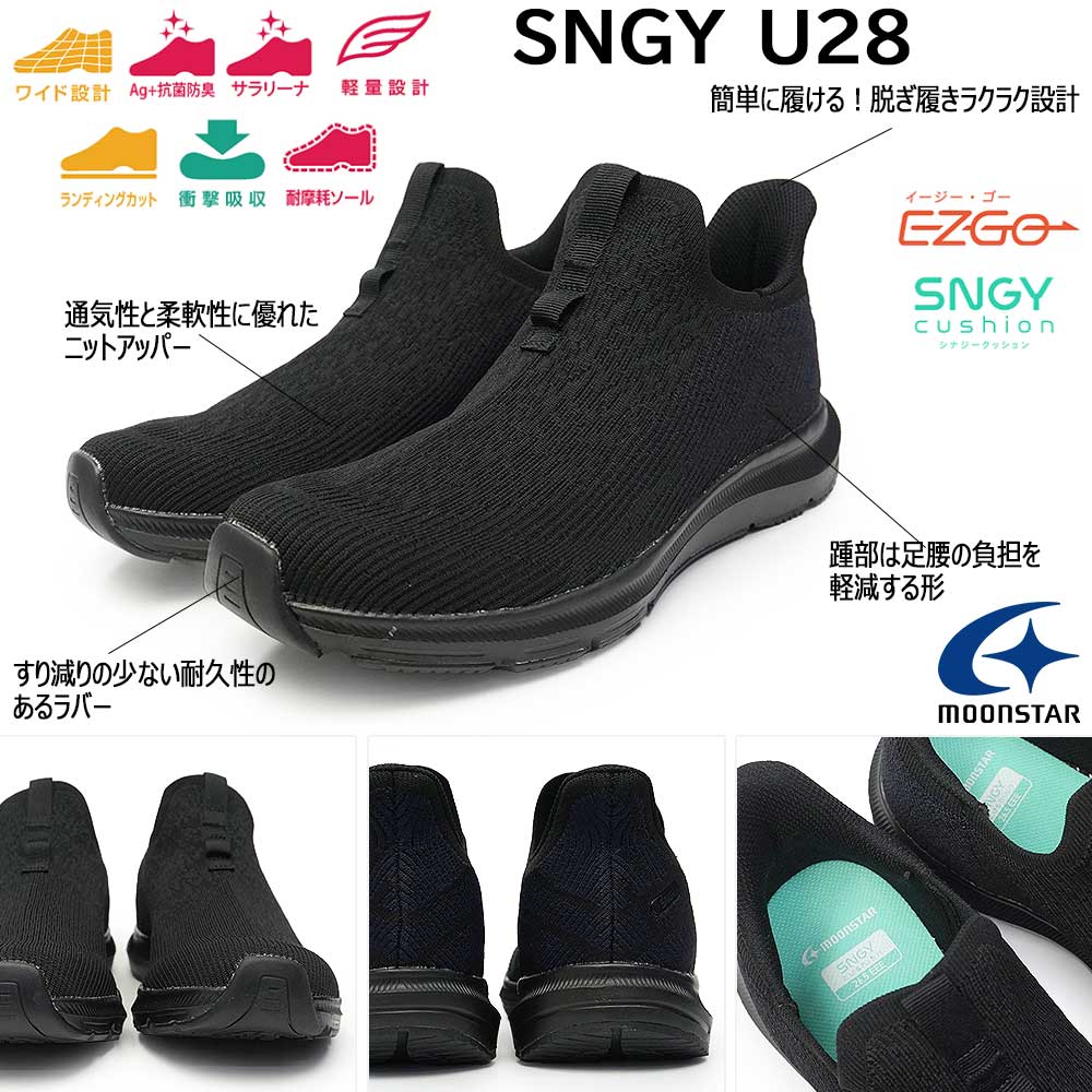 手を使わずスポッと履けるムーンスターのレディース・メンズ兼用スニーカーです。軽さと柔らかさが魅力のクッション性に優れたSNGYcushion(シナジークッション)シリーズです。