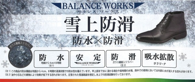ムーンスター」のメンズビジネスシューズ、足の「ストレス」を軽減する「バランスワークス」シリーズに凍結路面対応のウィンターモデルが登場。「柔らかさ」と「安定性」の機能はそのままに、雨や雪の日も快適に履いていただける「防水×雪上防滑」機能を搭載しています。防水革と防水フィルムによる地面から4cm8時間の防水設計。アウトソールは「ガラス繊維入り」の特殊ラバー採用により、雪面、凍結路面でも防滑性を発揮します。ライニングにはムレ対策として吸水拡散素材「サラリーナ(R)」を全面的に使用、臭い対策として「Ag+抗菌防臭」を搭載。ビジネスシーンに足元から快適を求めるあなたにおすすめ。雪国へのお出掛けや出張、フォーマルにも使え足元を引き締めるストレートチップモデルです。幅、サイズ感・・3E、ややゆったりしたサイズ感です。